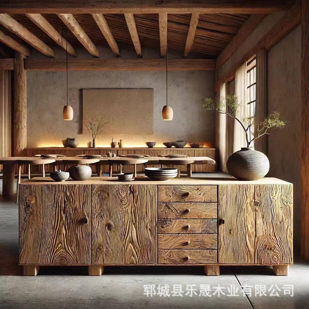 侘寂风老榆木落地式靠墙边柜中古茶庄储物柜茶水玄关风化复古边柜