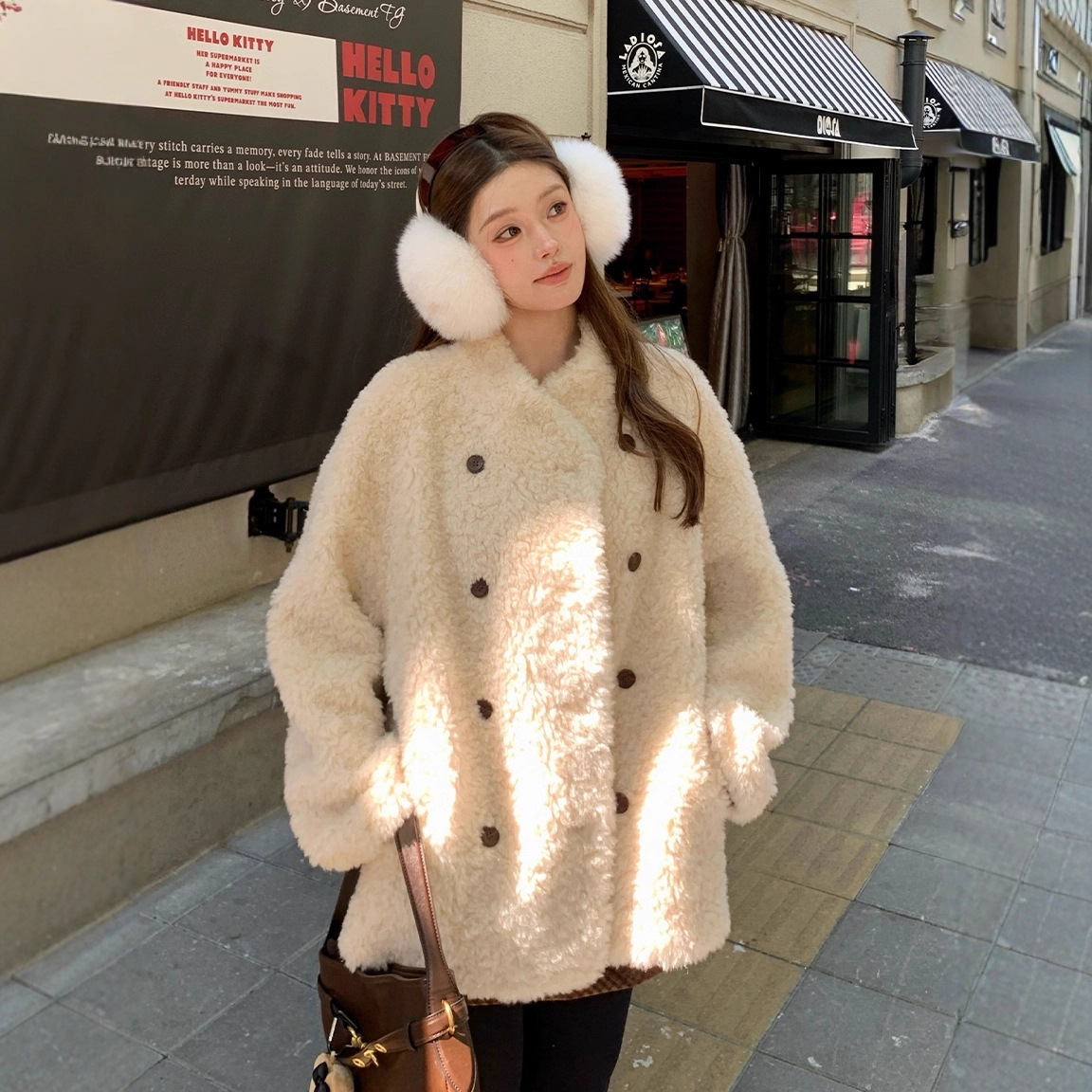 100绵羊羔毛休闲风双排扣2025冬季新款皮毛一体皮草外套女中长款