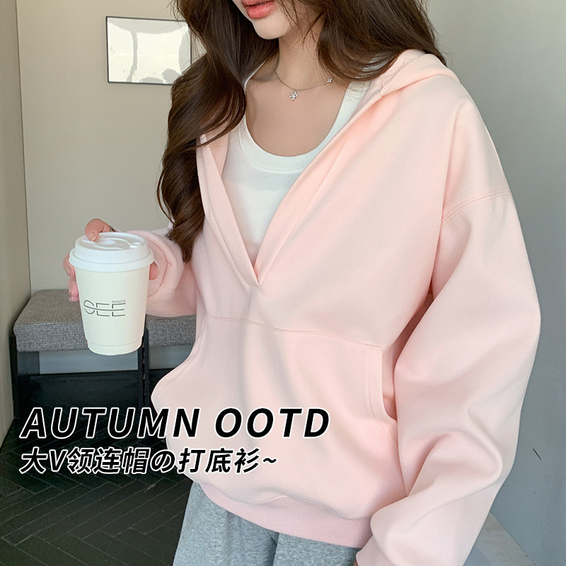 秋冬百搭宽松领连帽卫衣外套女显瘦带口袋舒适休闲慵懒风上衣女