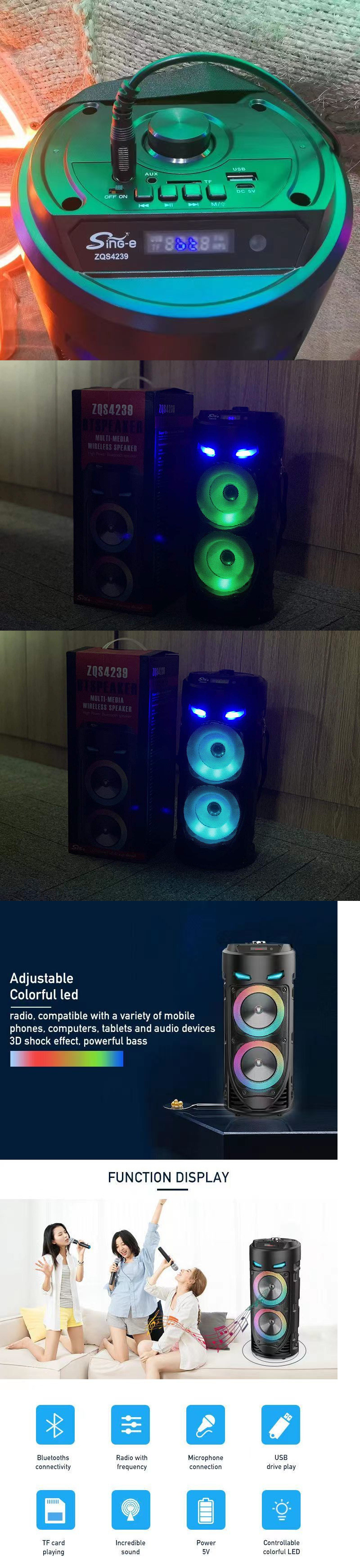 原厂凑销量重低音立体声双4寸蓝牙音响带麦克风幻彩灯背带音箱