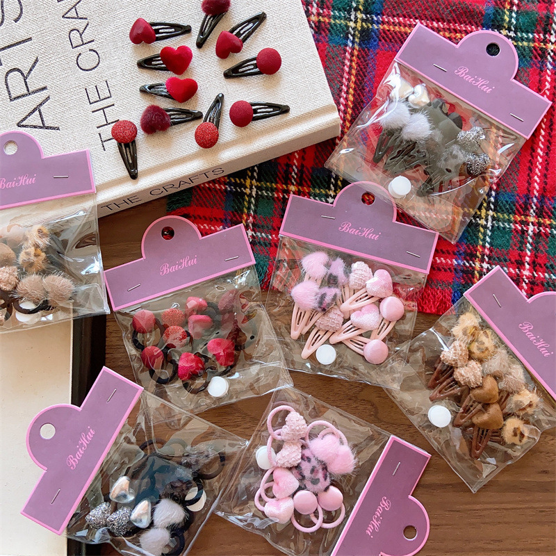 新款韩系儿童秋冬节日毛绒绒迷你基础纽扣发夹女童几何形爱心袋装