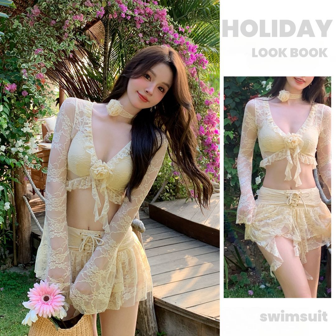 2025 新しい純粋な欲望スタイルのレースフラワーベルスリーブ痩身プッシュアップ温泉休暇スカートスタイルスプリット水着女性用