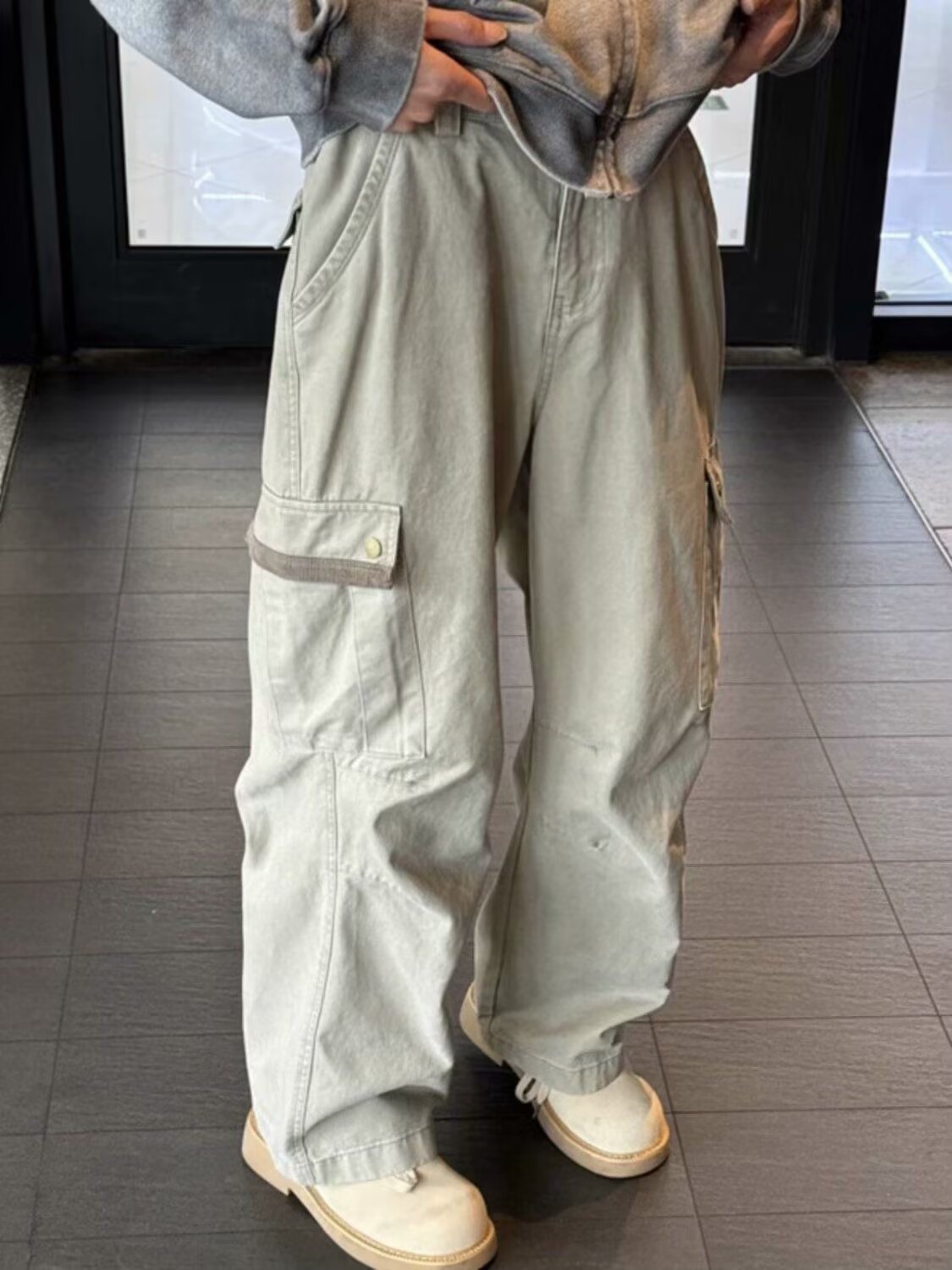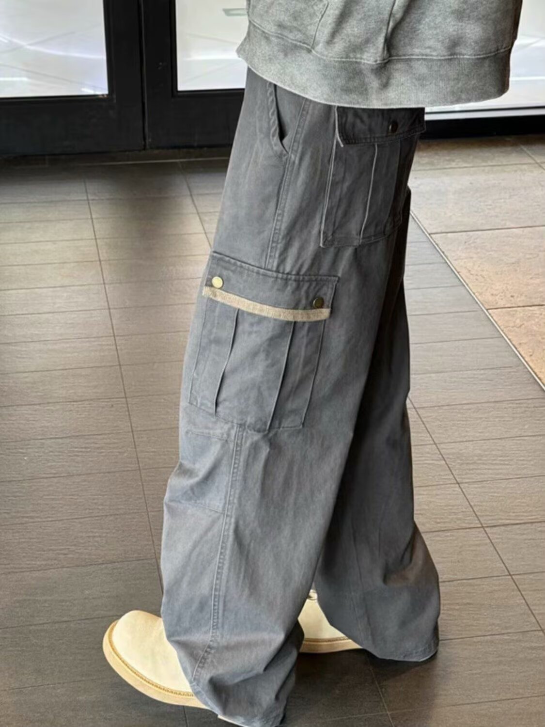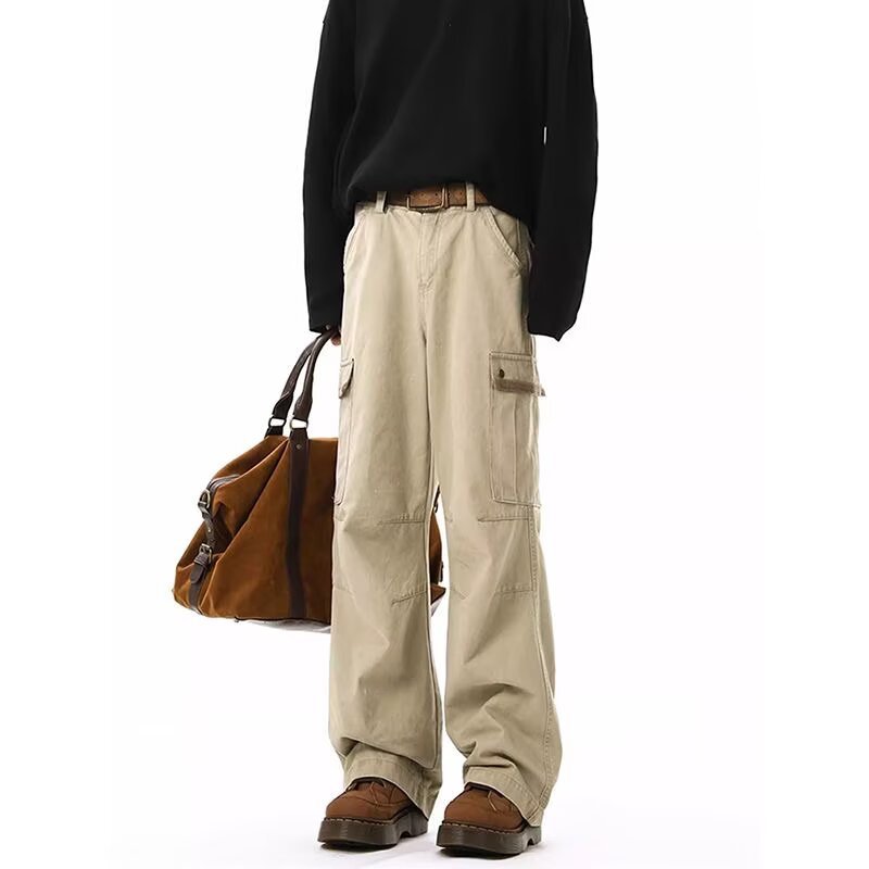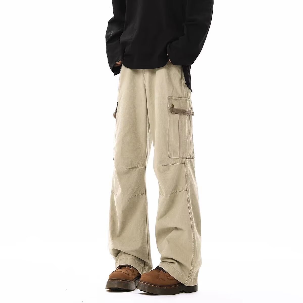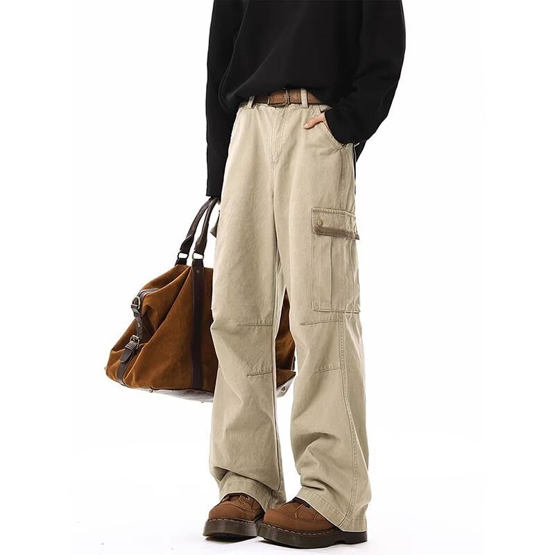 2025 レトロウォッシュ加工マルチポケットワークジーンズメンズルーズカジュアルストレートパンツ