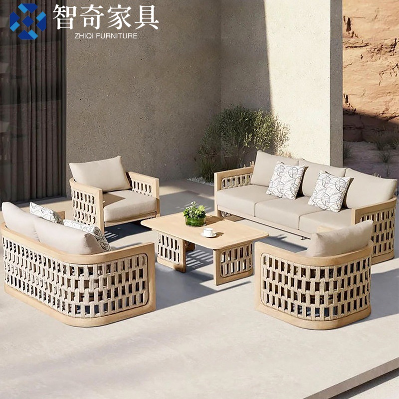 北欧屋外レジャーチーク材ソファセット庭屋外ベランダ別荘露天藤編ホテル実木家具