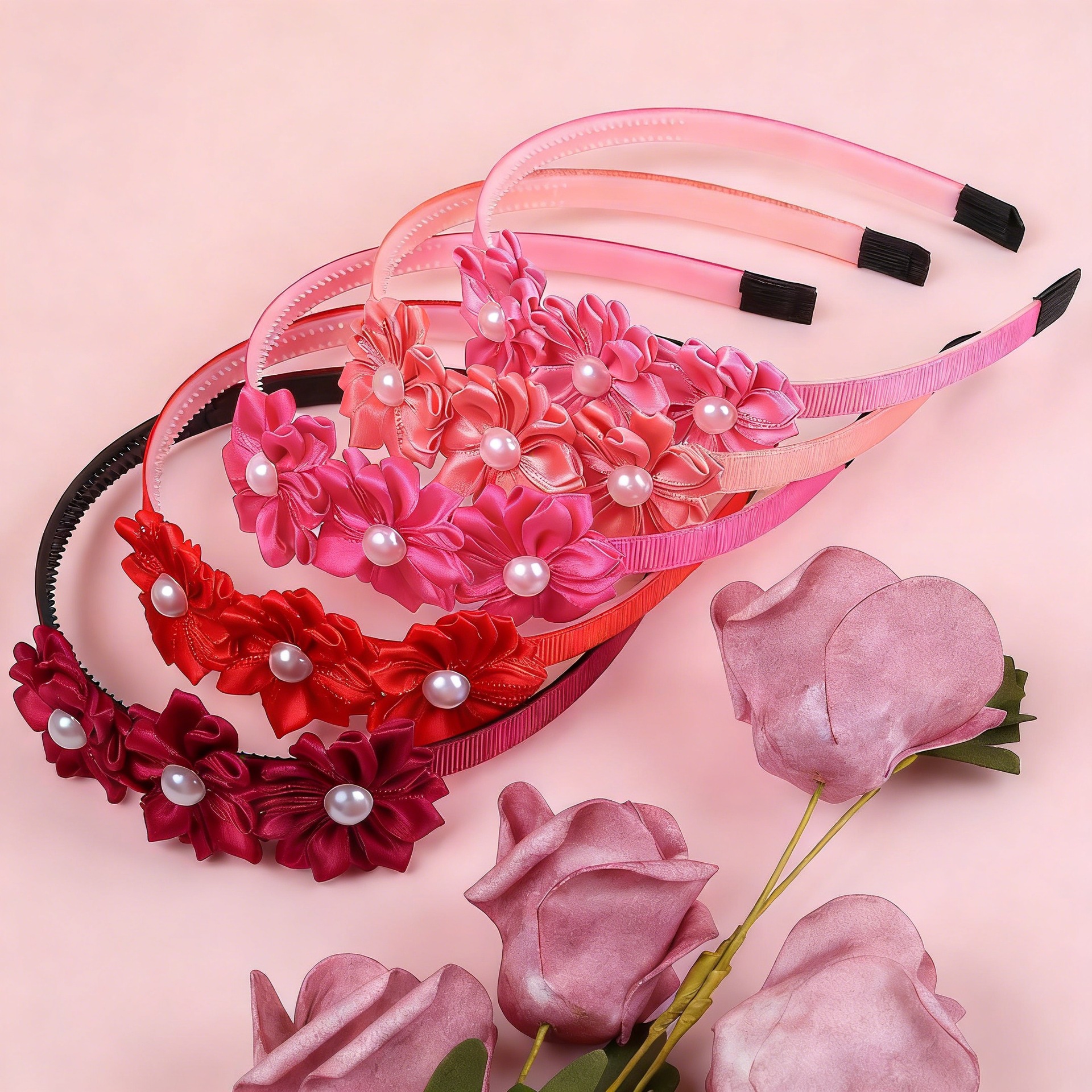 クロスボーダー新しいファッション多花びらフラワーヘッドバンドパールフラワーヘッドバンド 3 プラスチックサテンヘッドバンドプリンセスヘアアクセサリー