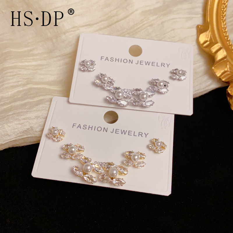 小香风微镶锆石交叉珍珠三件套耳钉精致时尚百搭通勤超闪耳环批发