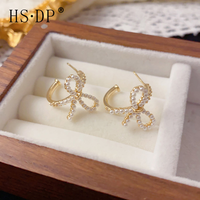 法式时尚甜美温柔百搭珍珠蝴蝶结耳圈小众气质简约设计感耳环批发