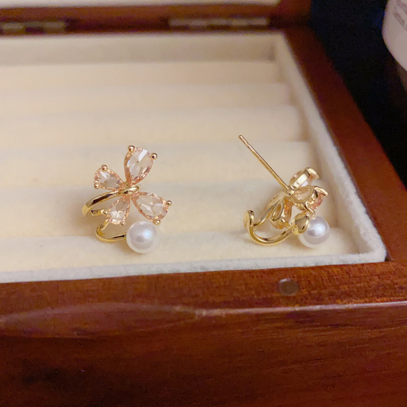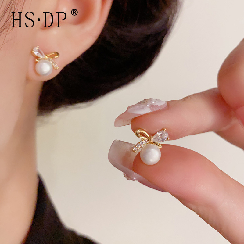 夏季新款甜美百搭镶钻蝴蝶结面包珠耳钉精致简约小巧轻奢耳环批发