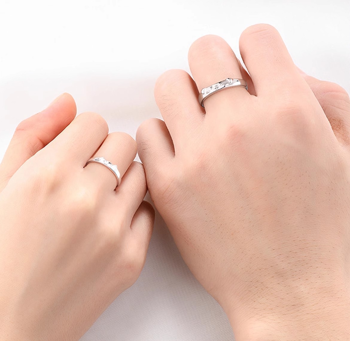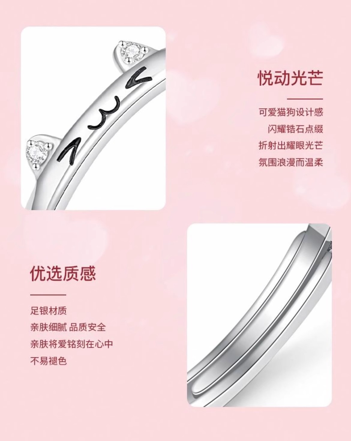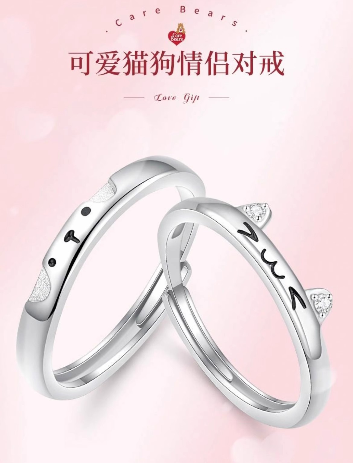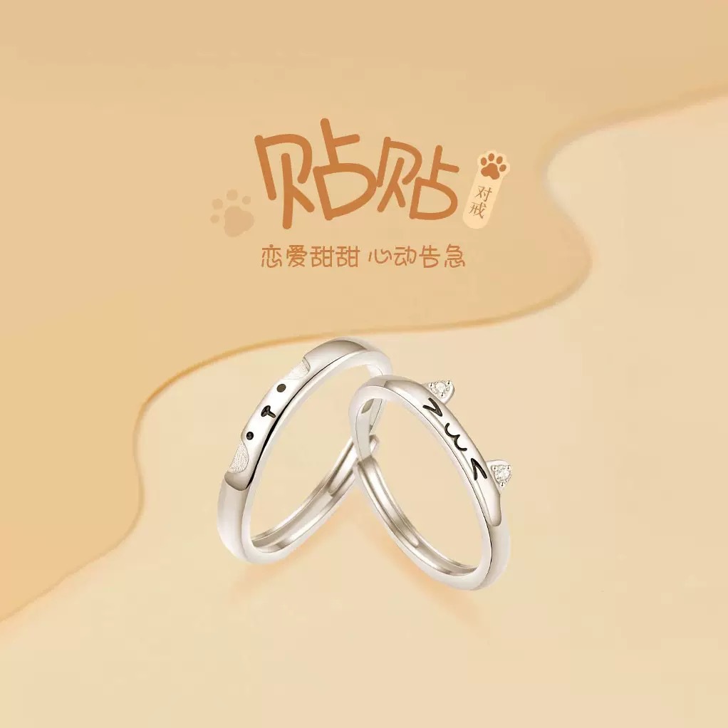 银誓s999纯银猫狗贴贴萌趣情侣对戒简约轻奢卡通指环开口可调节戒