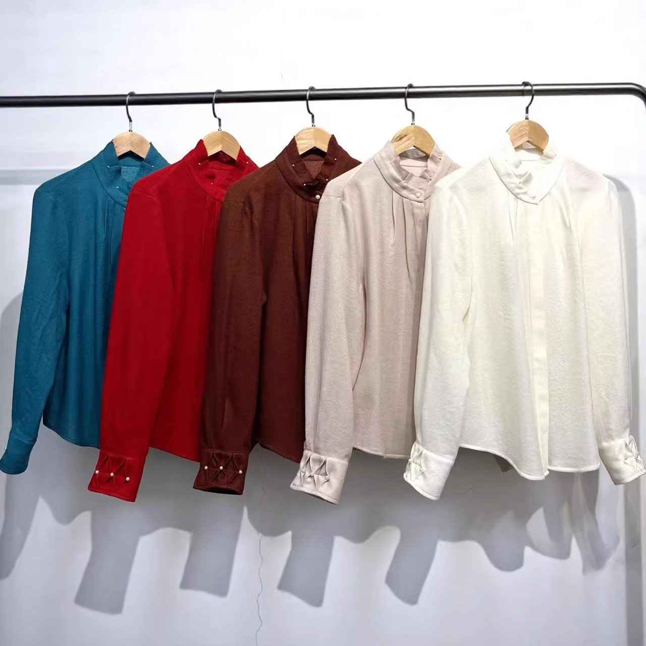 2026年春季新款通勤淑女风薄款人丝提花双层小立领打底长袖上衣女