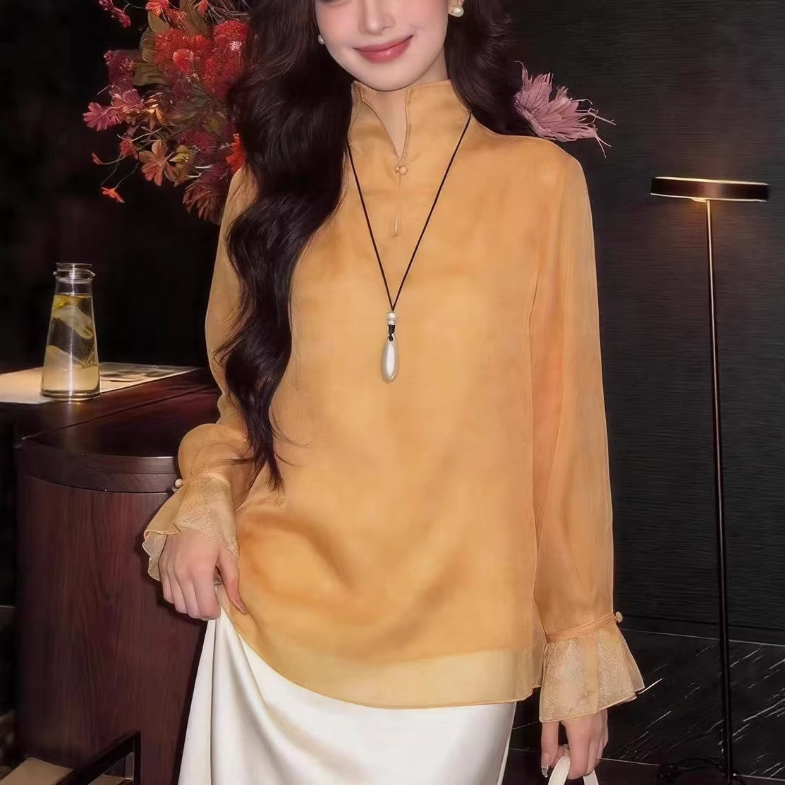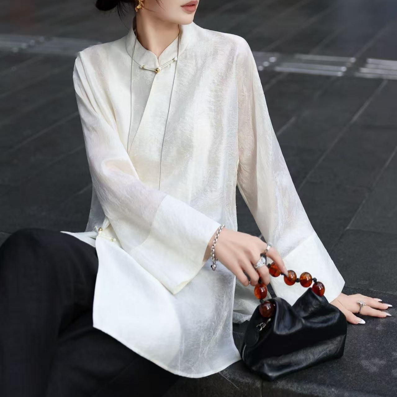 2026早春新中式立领斜襟盘扣中长款天丝浮光绸复古国风衬衫上衣女