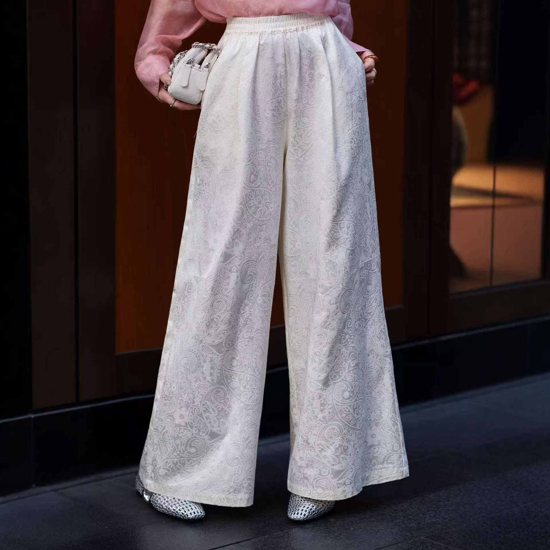 新中式人丝腰果花提花阔腿裤女垂感复古国风松紧腰宽松休闲直筒裤