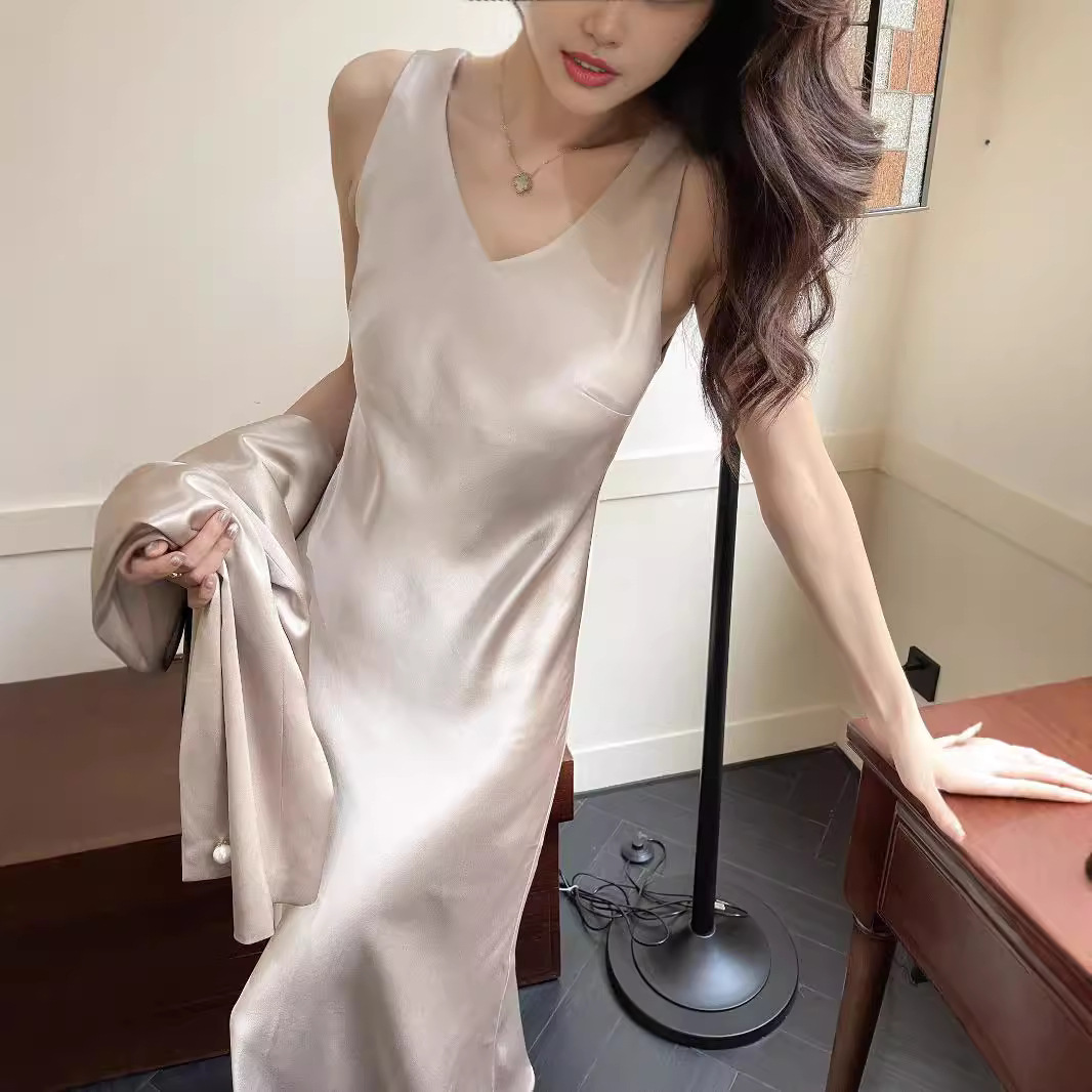 高级感酢酸サテンストラップワンピースレディースプロ通勤インナースカートvネックノースリーブベストロングスカート