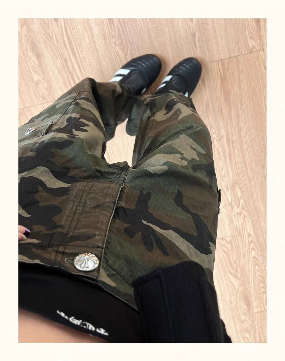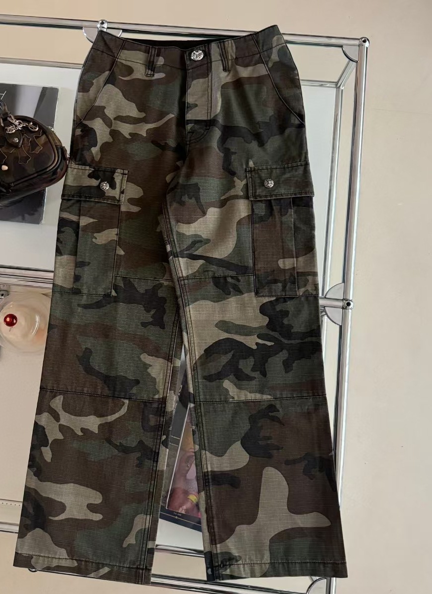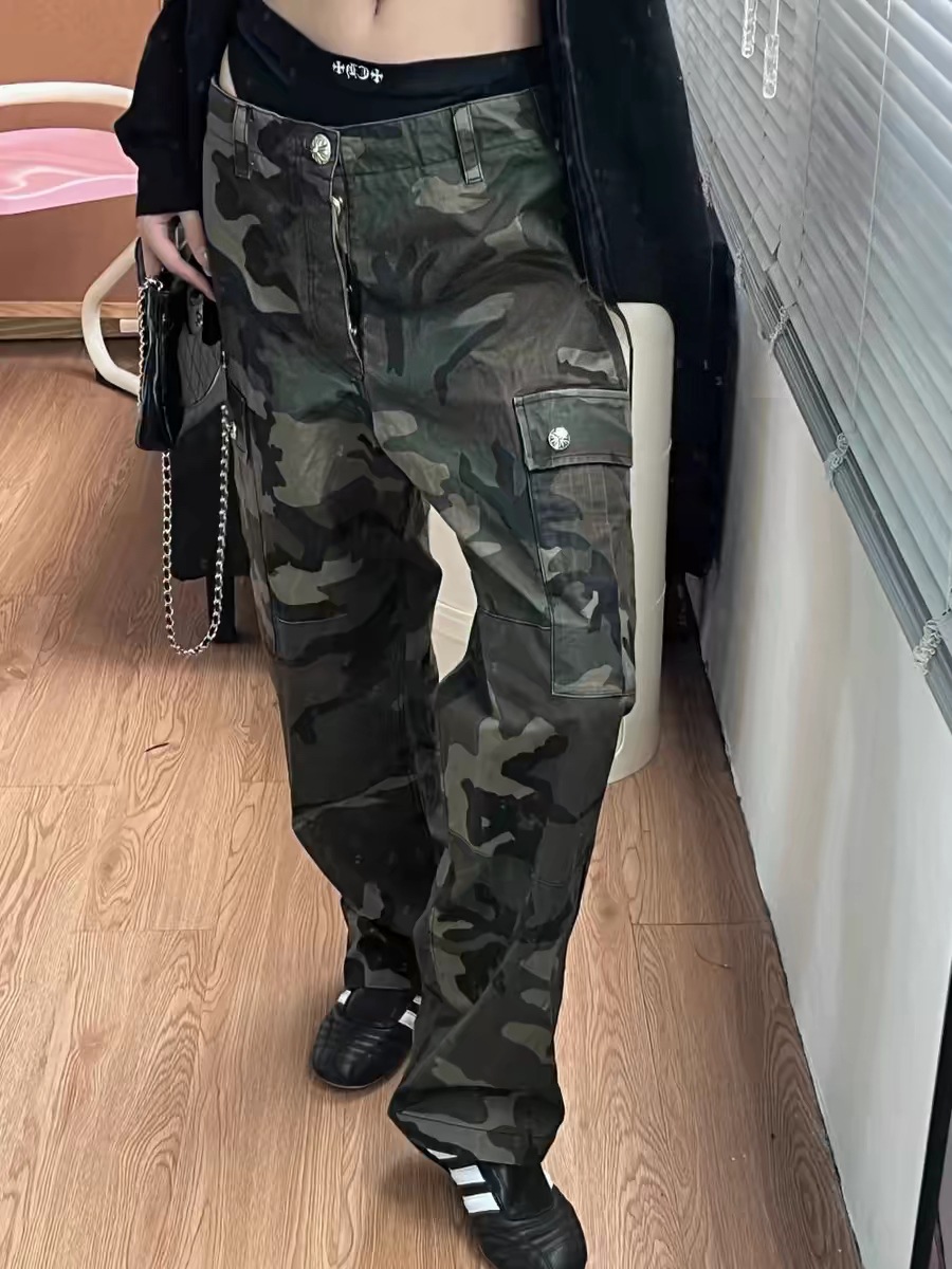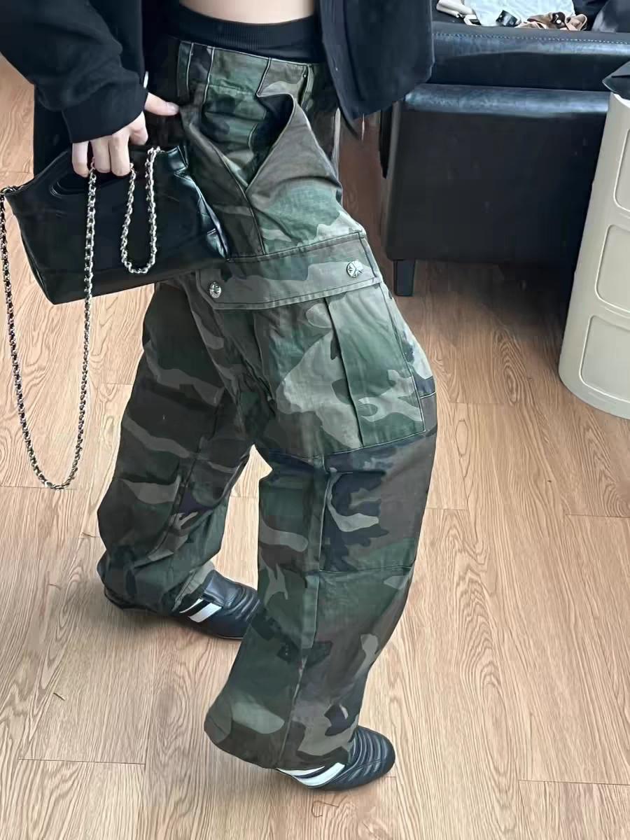 2025ssグラムの新しいアメリカのギャルの復古の工装のズボンの高い腰の広い足の十字の大きいポケットの迷彩のズボン