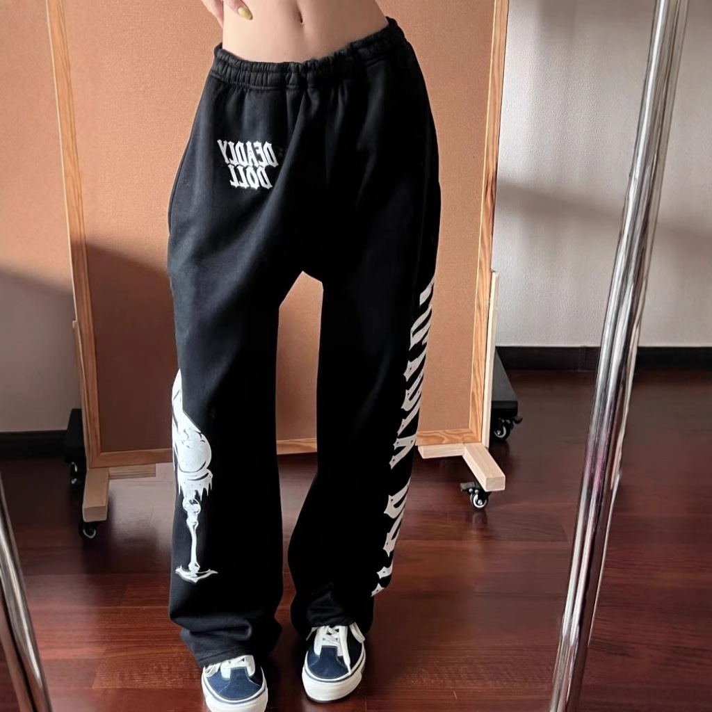 DeadlyDoll~ アメリカンスタイルのレイジースローマン白黒メインカラーガラスの女の子巾着ゴムウエストスウェットパンツ