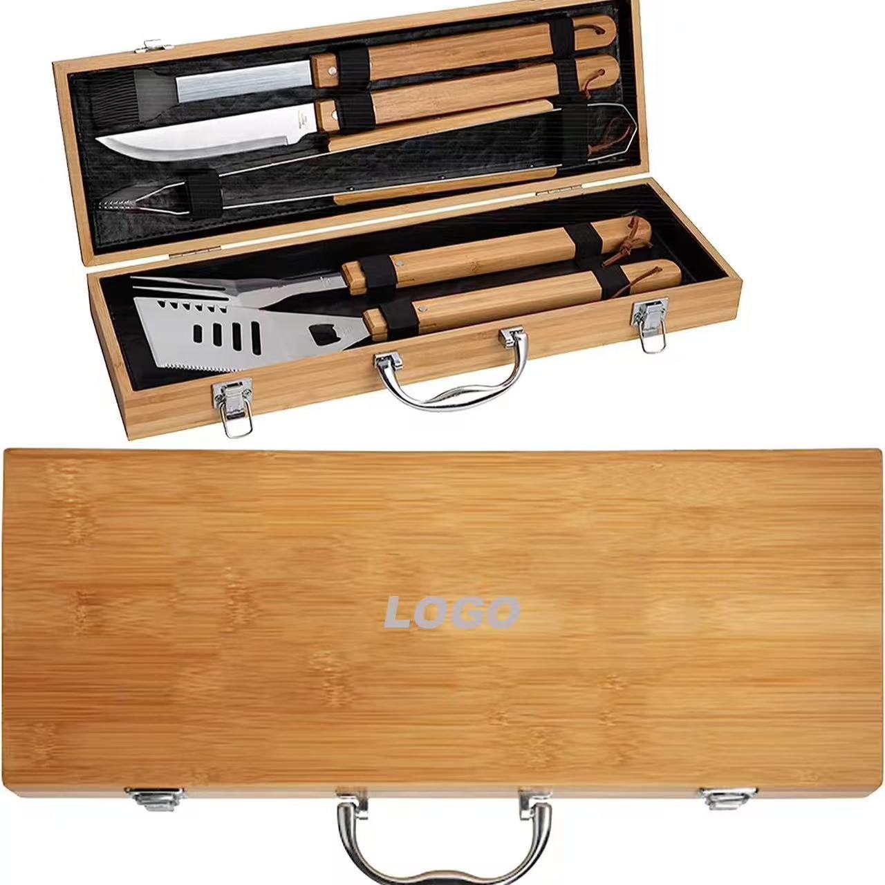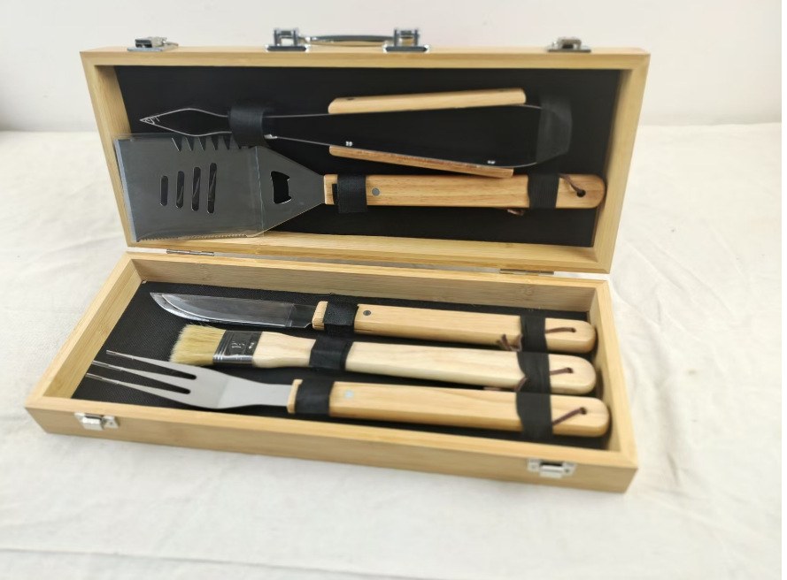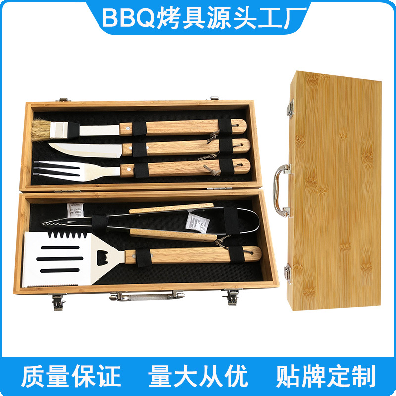 厂家现货供应不锈钢烤具 5件套竹盒烤具 橡木柄烤具 木盒BBQ工具