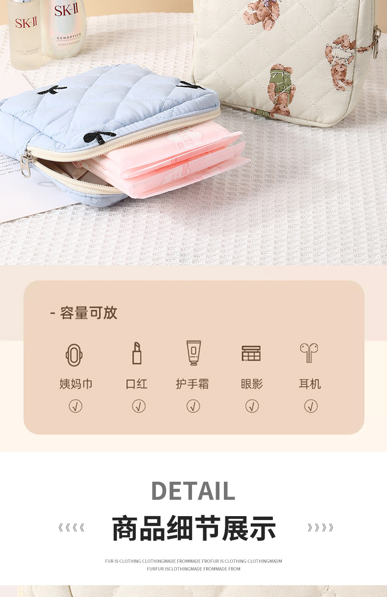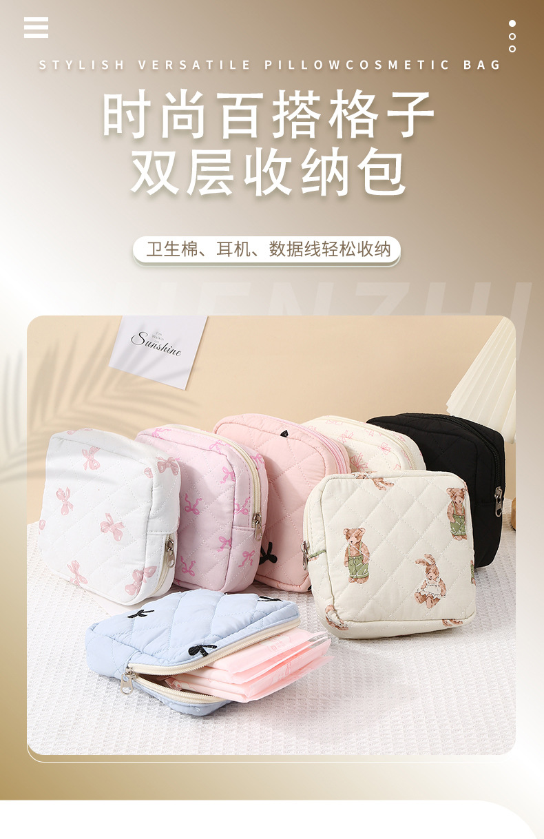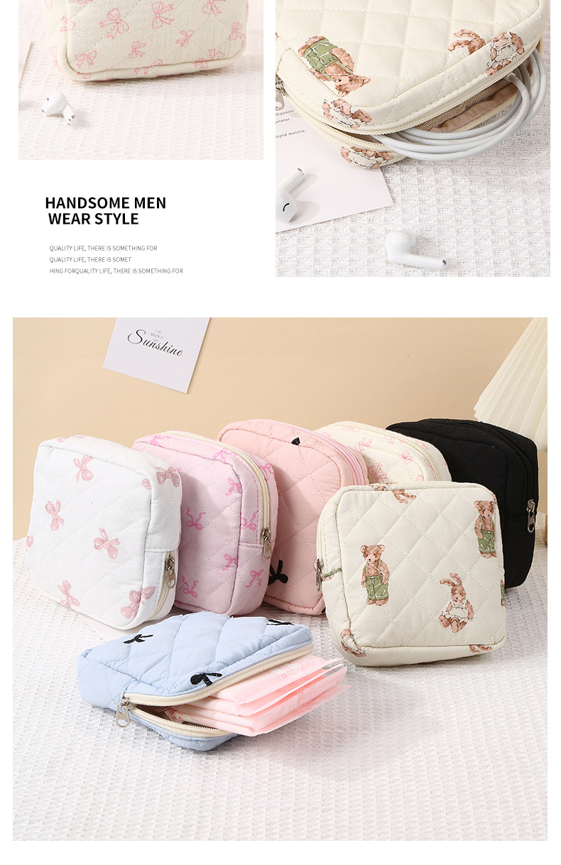 新しいキルティング加工のクマ柄花柄口紅入れ、イヤホン、データケーブル、小銭入れ、生理用品、化粧品、化粧ブラシ入れ