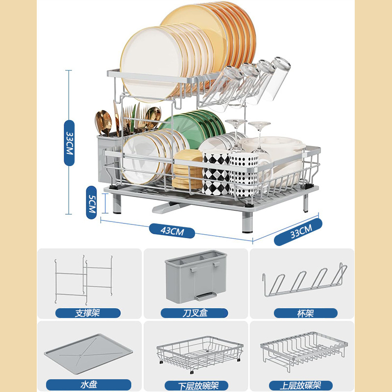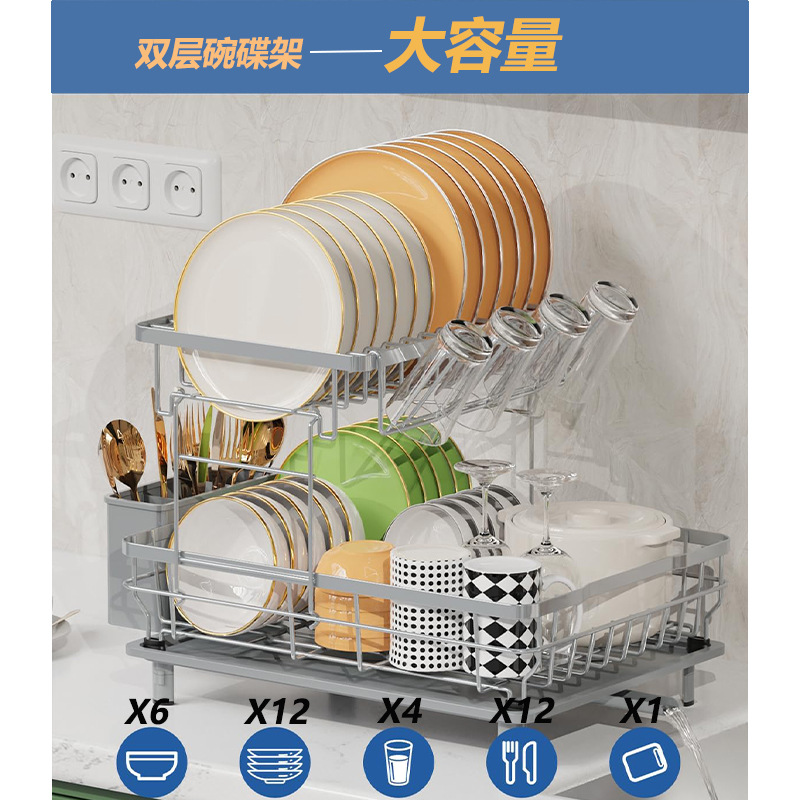食器や食器用の二層床置き排水ボウルラックキャビネット、小さなカウンタートップのボウル、箸、プレートの収納ラック