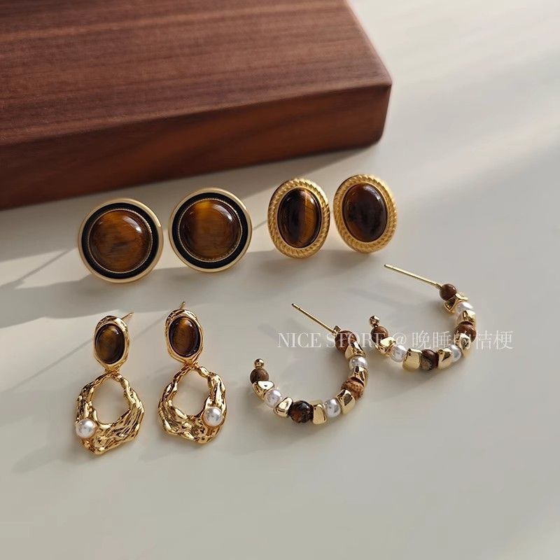 晚睡的桔梗「原野之息」法式复古虎石珍珠耳环 高级感美拉德耳饰