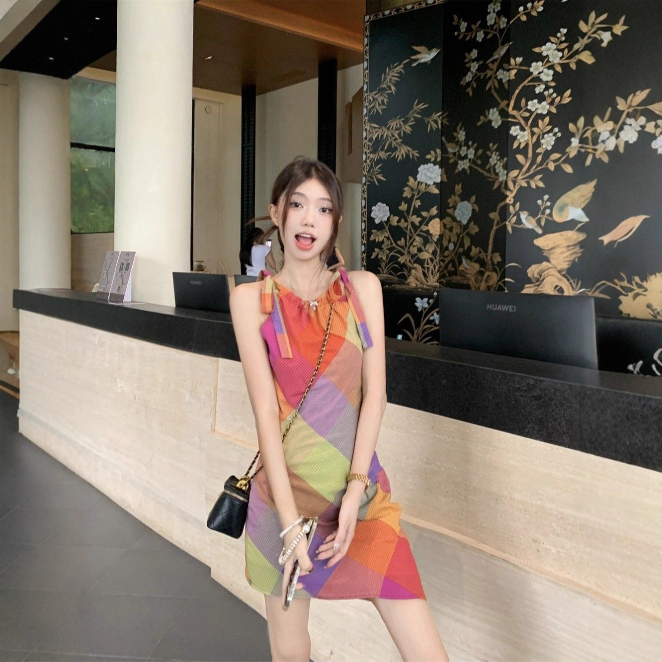 多巴胺穿搭挂脖无袖格子连衣裙女夏季漂亮独特设计感收腰气质裙子
