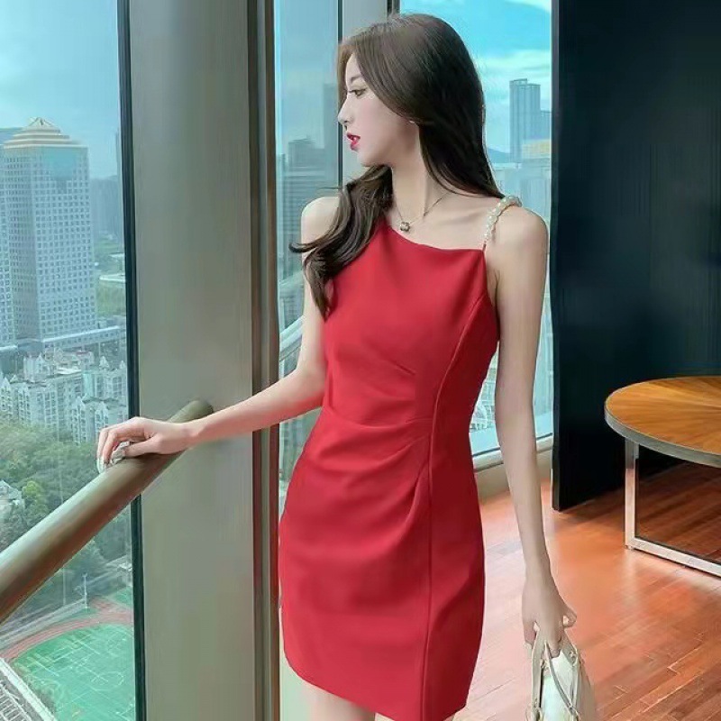 2025年新作パール付きキャミワンピース レディース スリムフィット ブラック 細見え おしゃれ フレンチレトロ風リトルブラックドレス