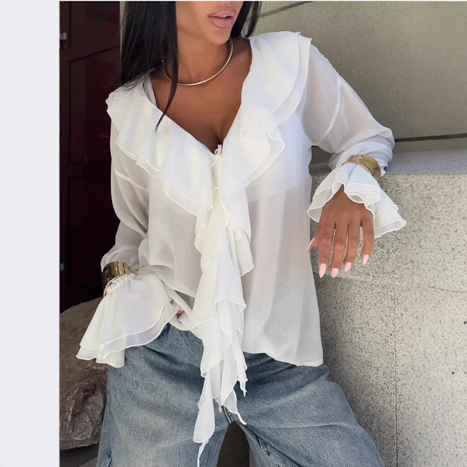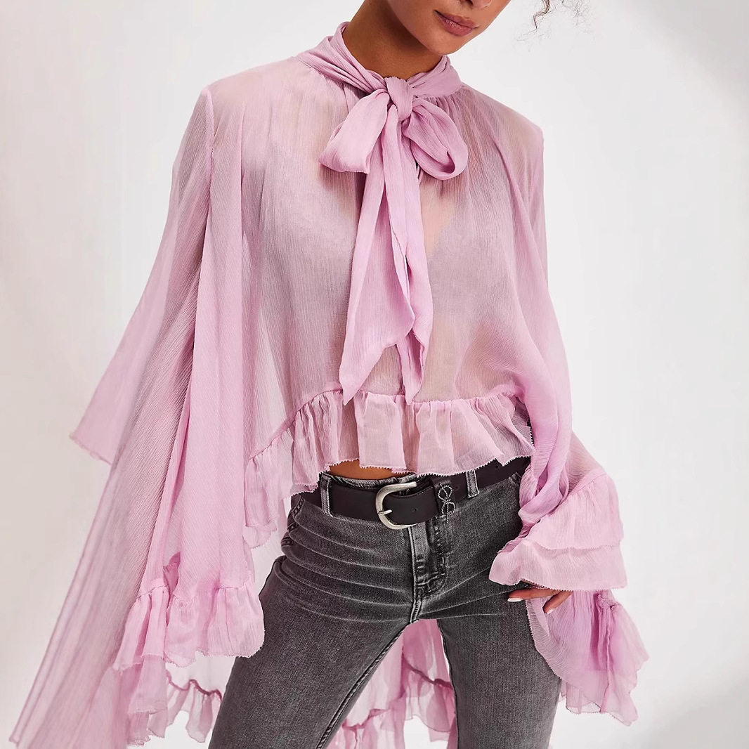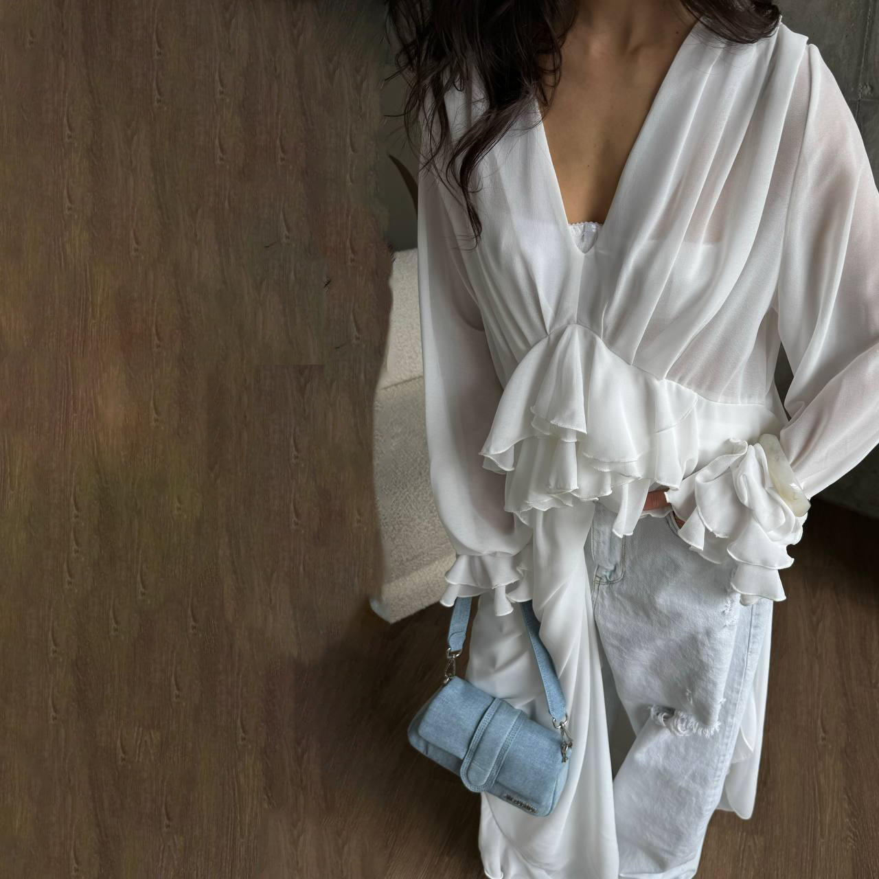 法式跨境气质小众荷叶边V领不规则拖地雪纺衫百搭喇叭袖上衣高级