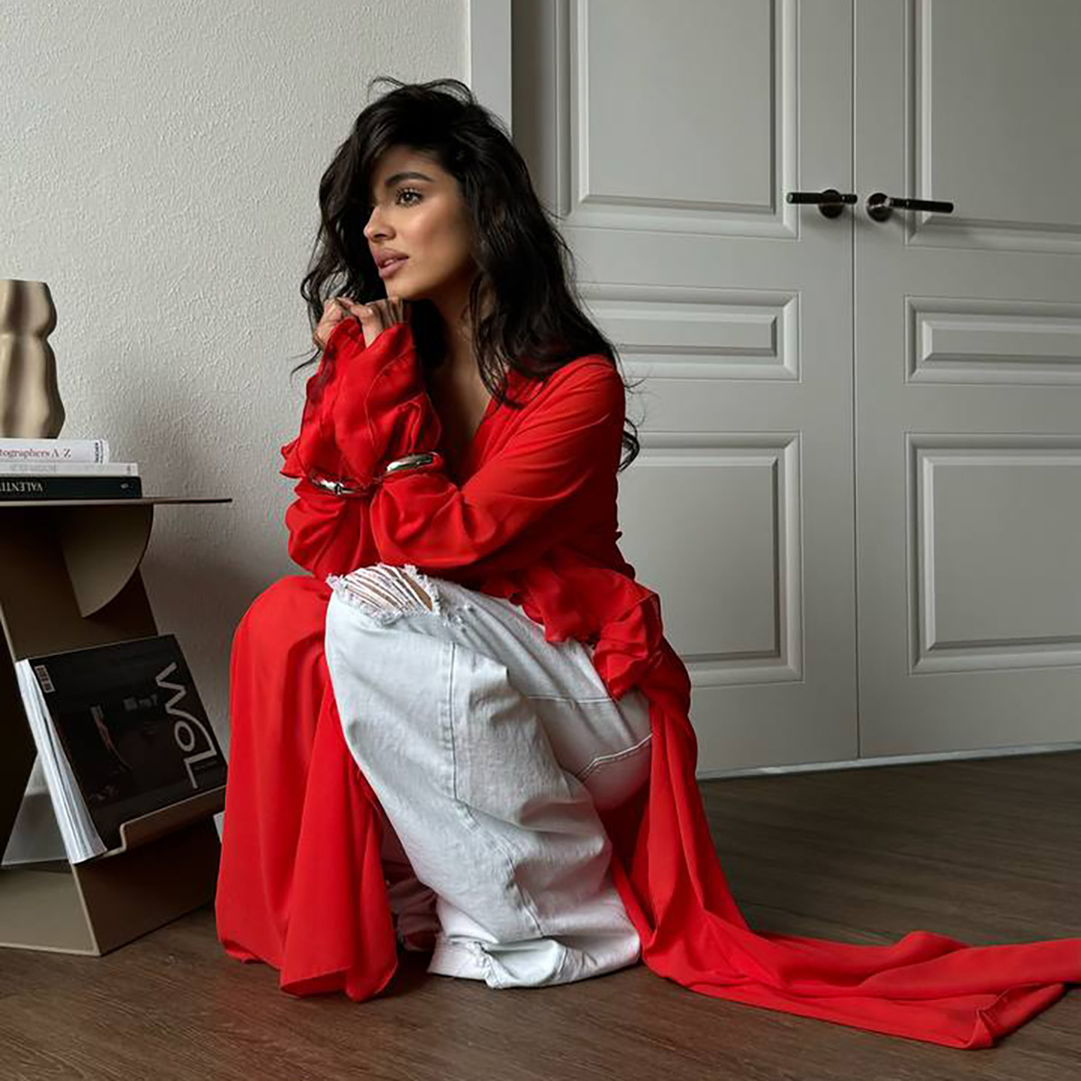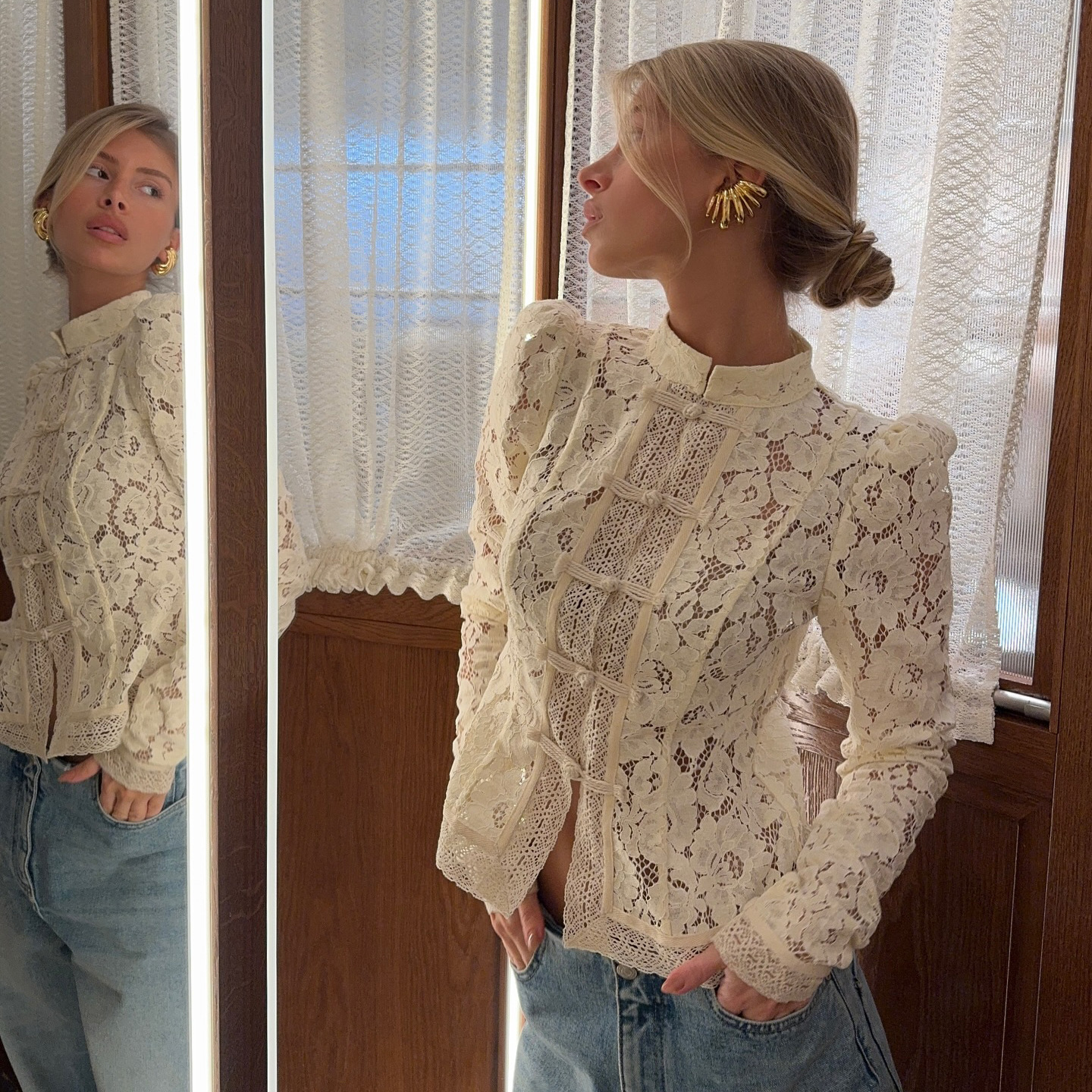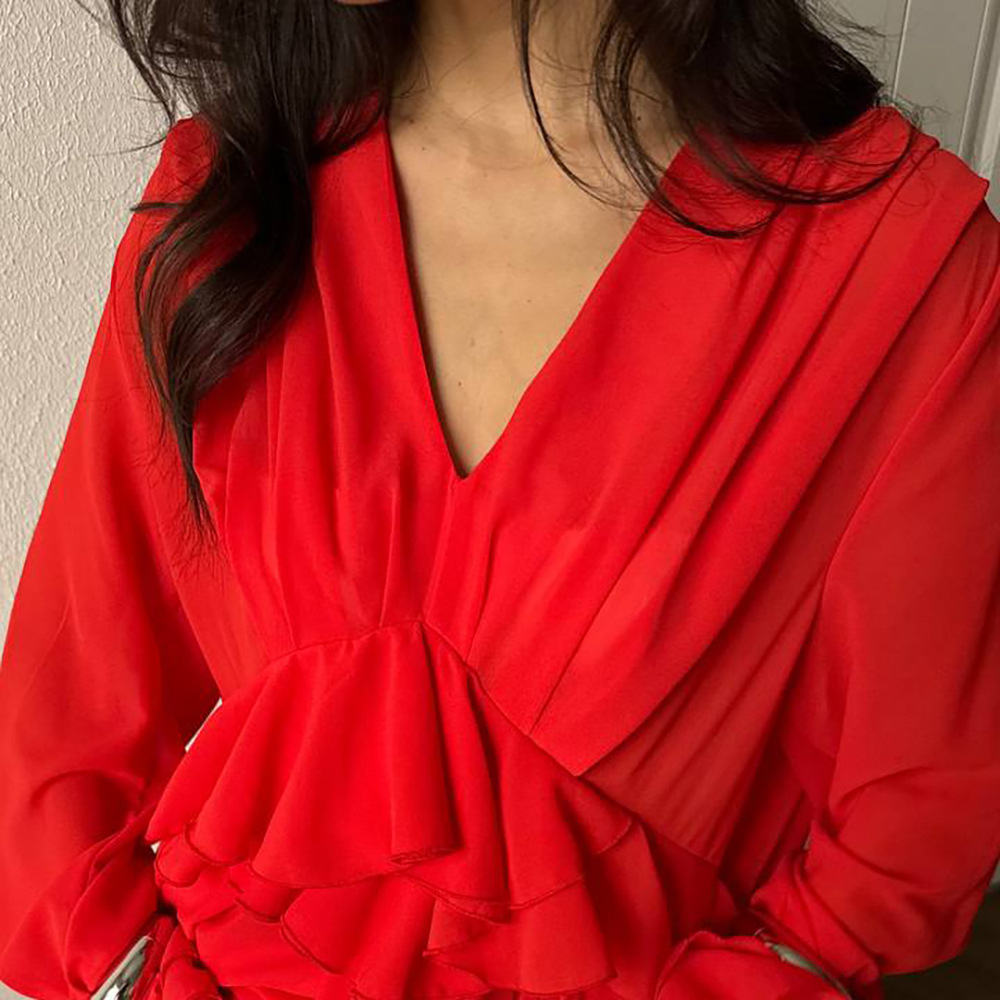 法式跨境气质小众荷叶边V领不规则拖地雪纺衫百搭喇叭袖上衣高级