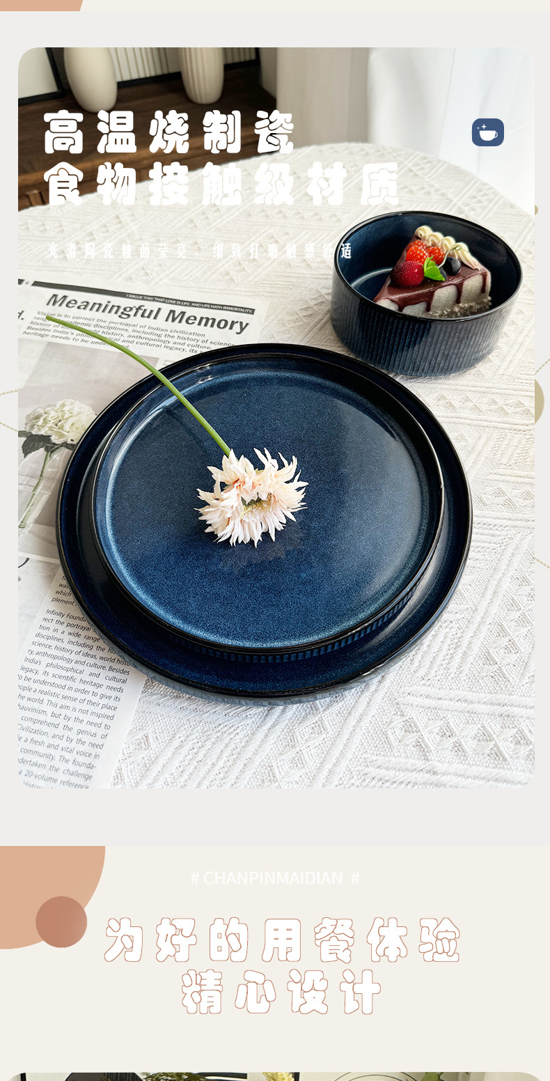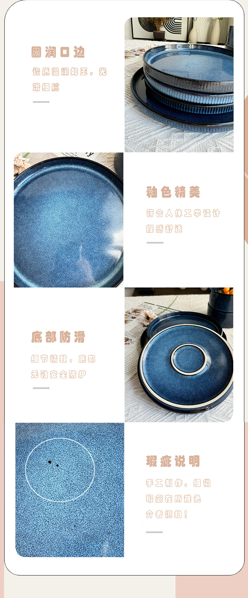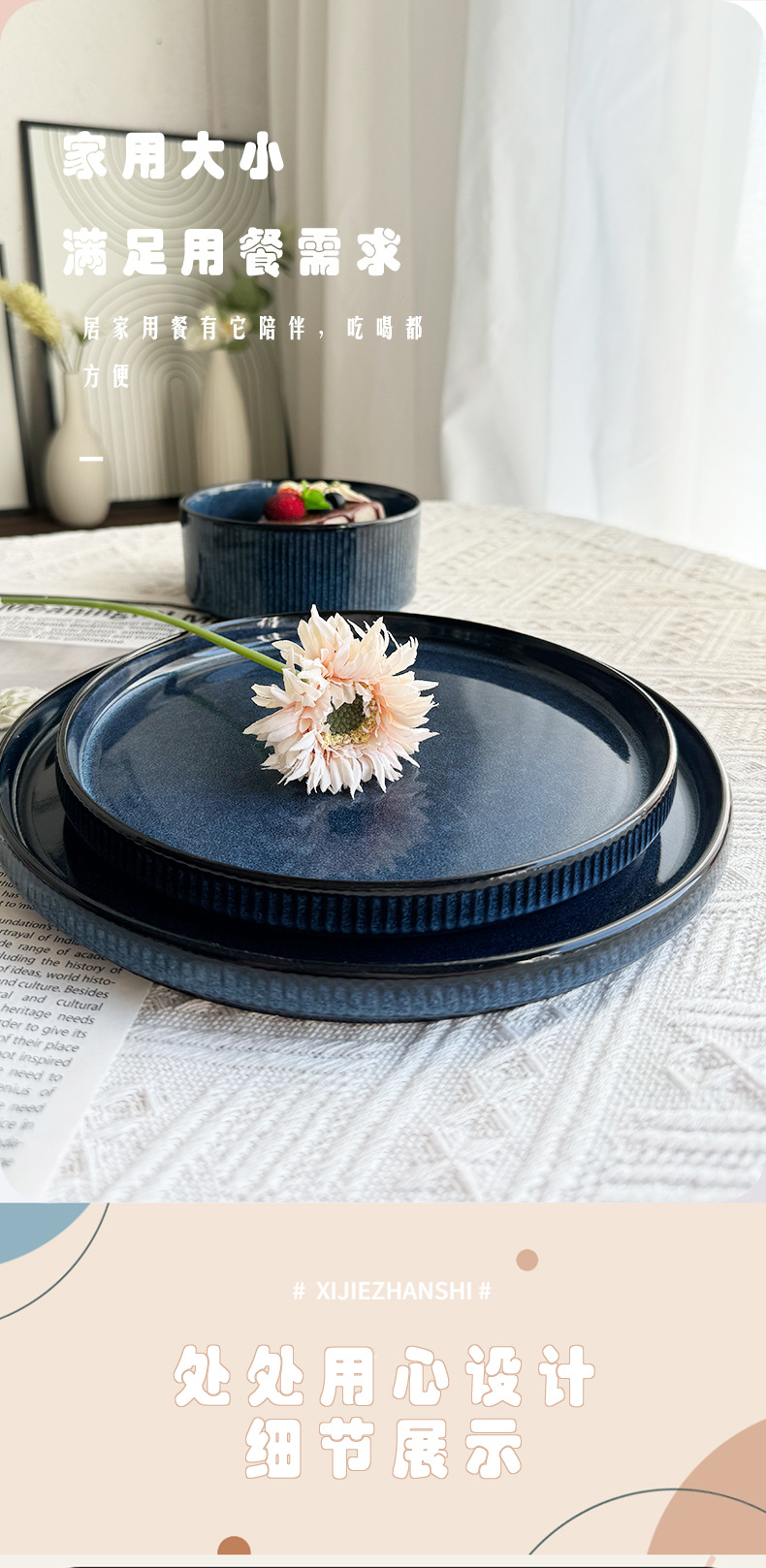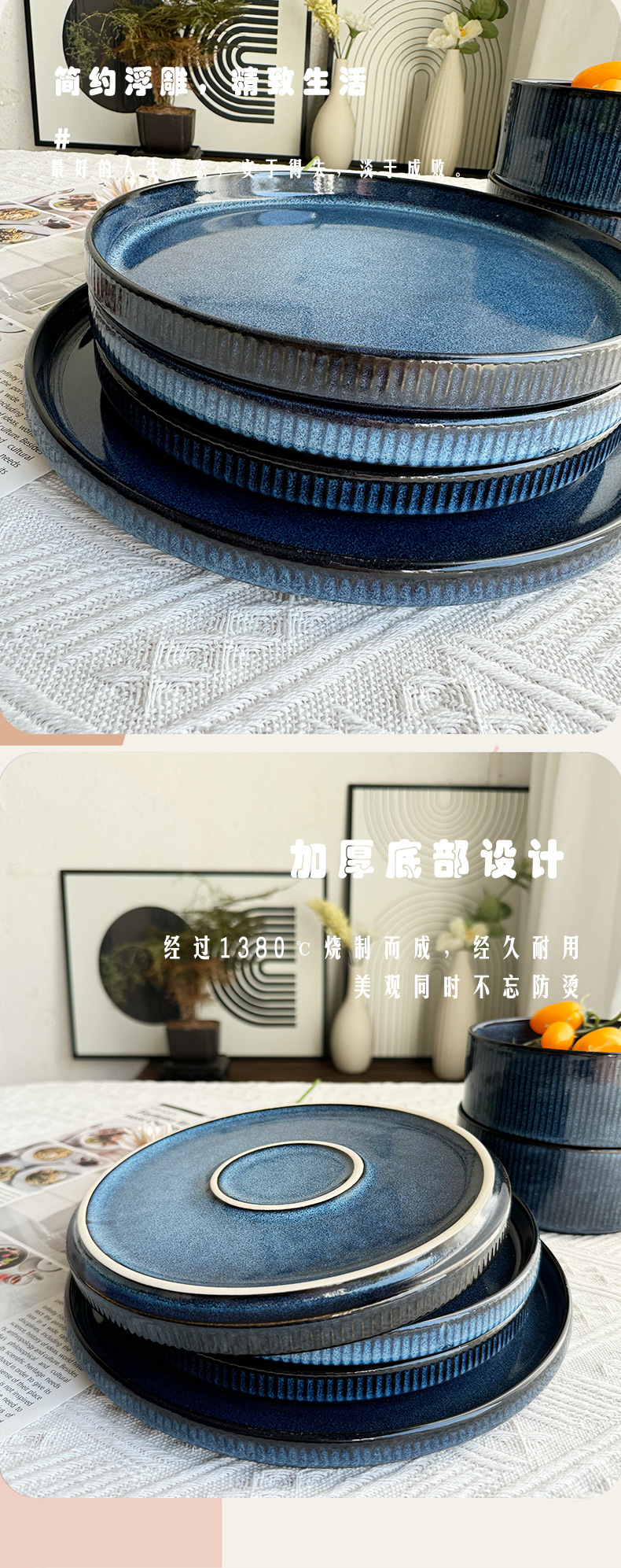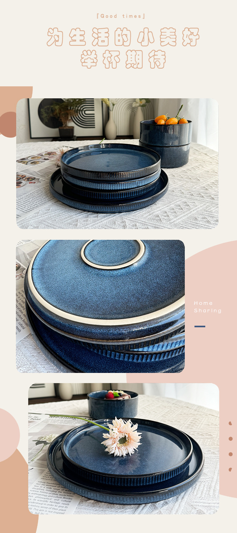 青色の窯変釉食器 和風レトロ陶器 クリエイティブなストライプ浅皿 ご飯茶碗 丼 家庭用食器セット