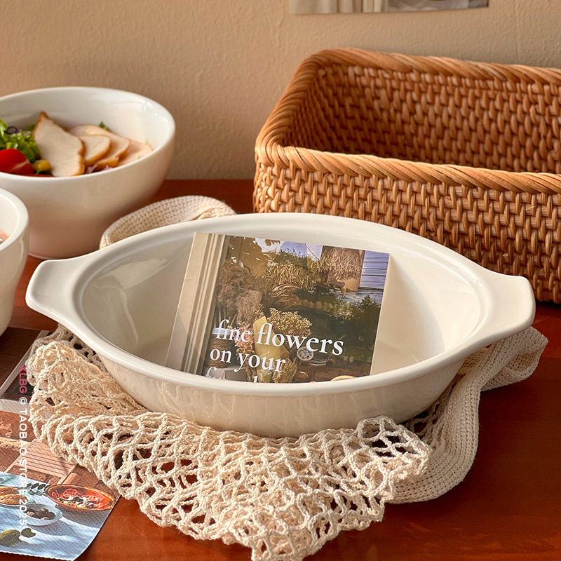 Ins風韓国風純白サラダ碗シンプルで高級感陶磁器二耳皿家庭用野菜皿楕円深皿