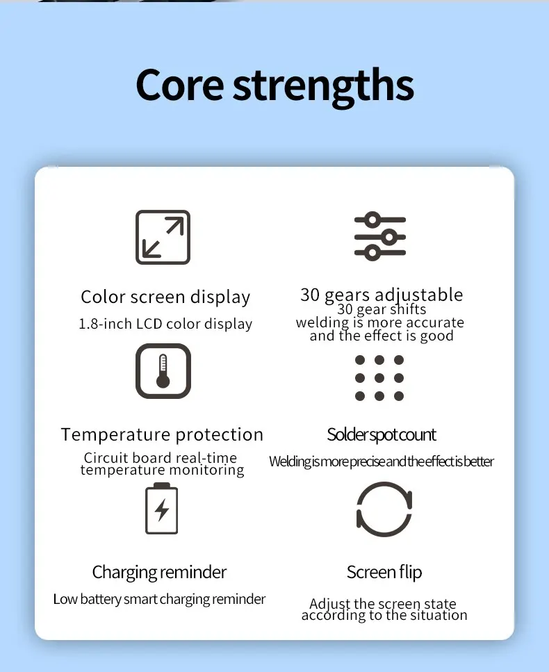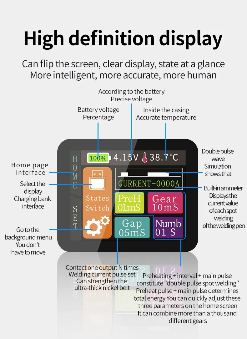 5. 材料/自检功能:采用优质 ABS 和 PCB 制成,具有极高的耐用性和性能稳定,使用寿命长。先进的电源管理和软件设计,焊接过程中无复位和归零。当焊笔接触镍板时,自动触发自检功能,响应时间为0.8s。