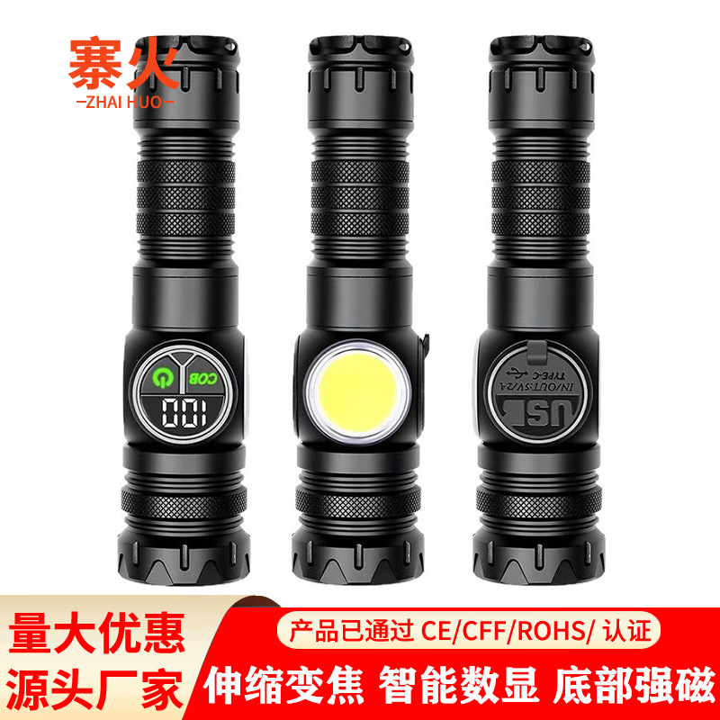 led手电筒户外强光超亮多功能伸缩变焦照明灯便携尾部磁吸工作灯