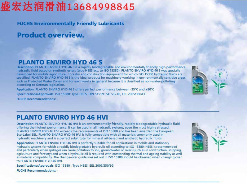 生态标签EEL。 PLANTO ENVIRO HYD 46 HVI与常用的所有材料完全兼容液压机械,是矿物油基和合成液压油的替代品。