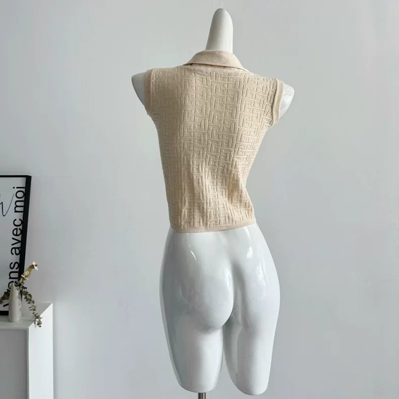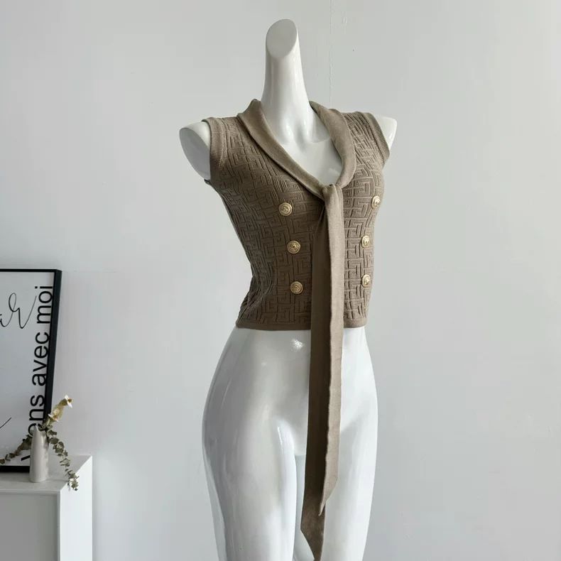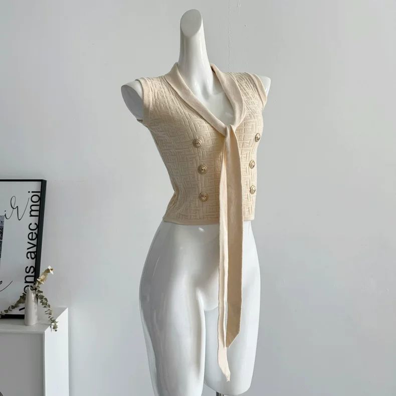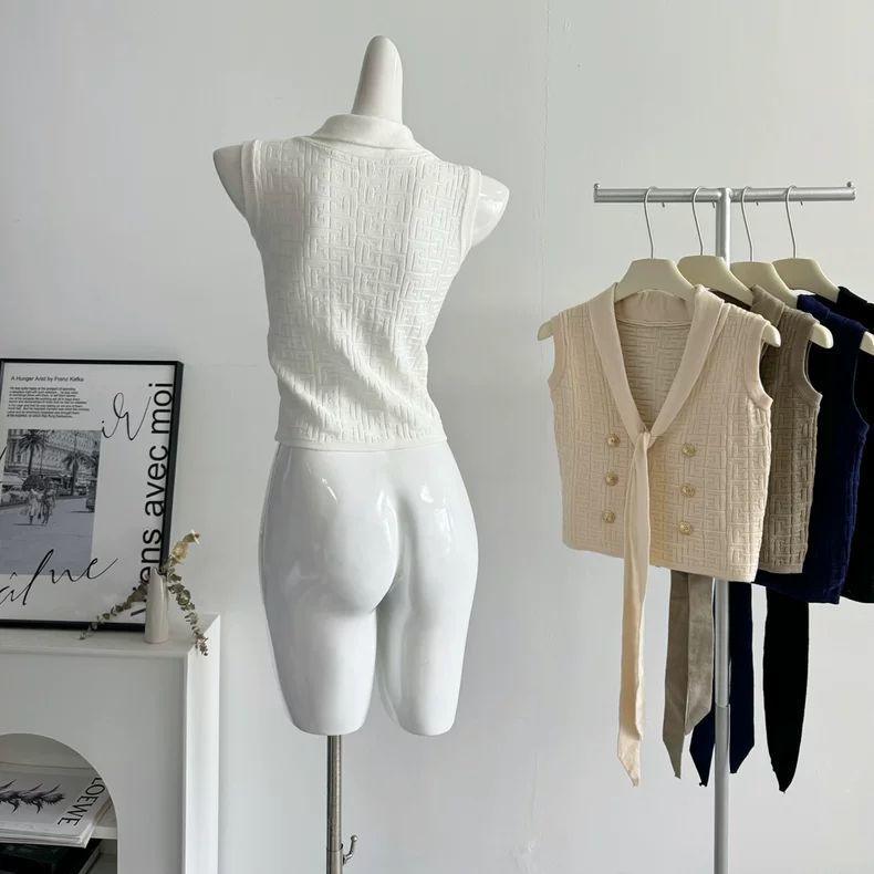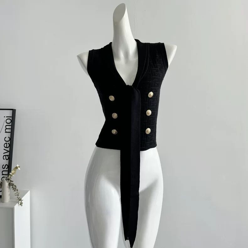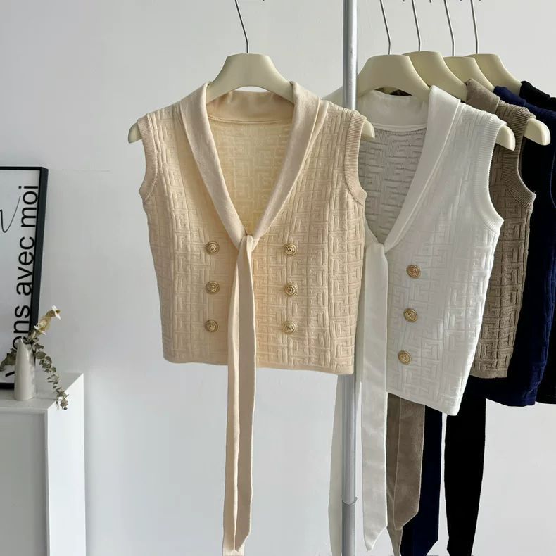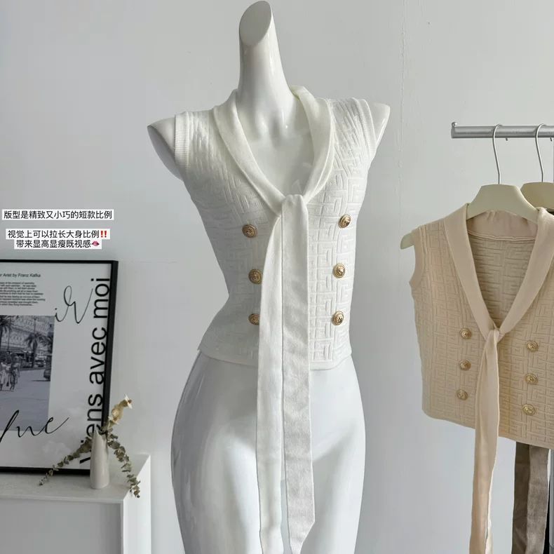 V ネックニットノースリーブベスト女性の夏の新しいフレンチスウィートガールカーブヘムスリムフィットアウタートップ