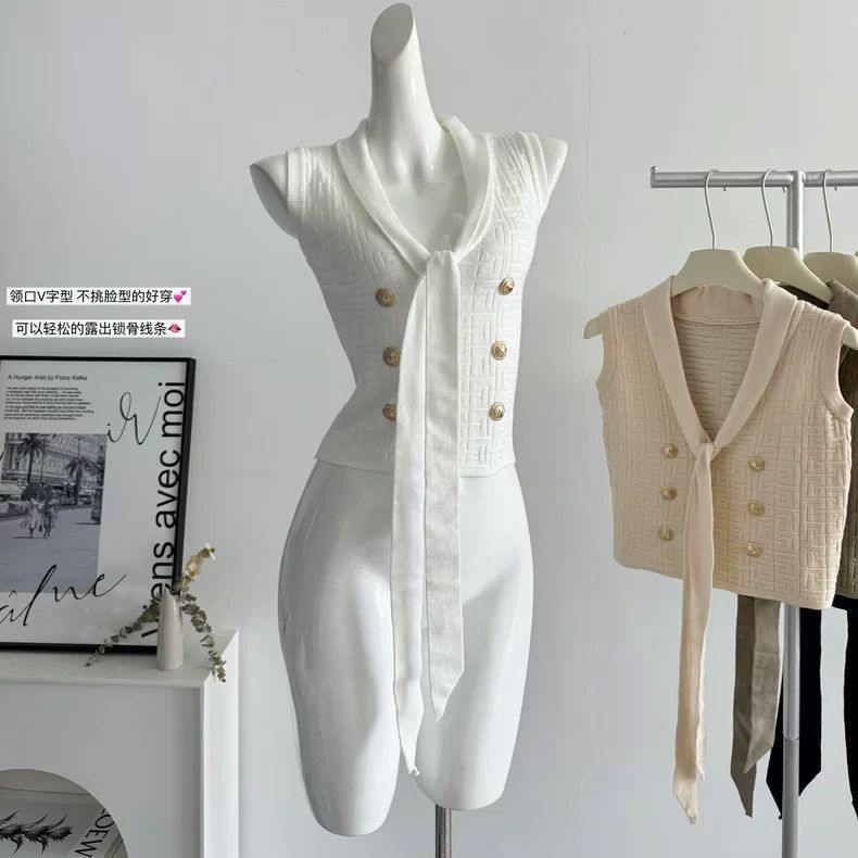 白いvネックの首には袖なしのtシャツがあります。女性2025新型夏の韓国系独特の美しい上着です。