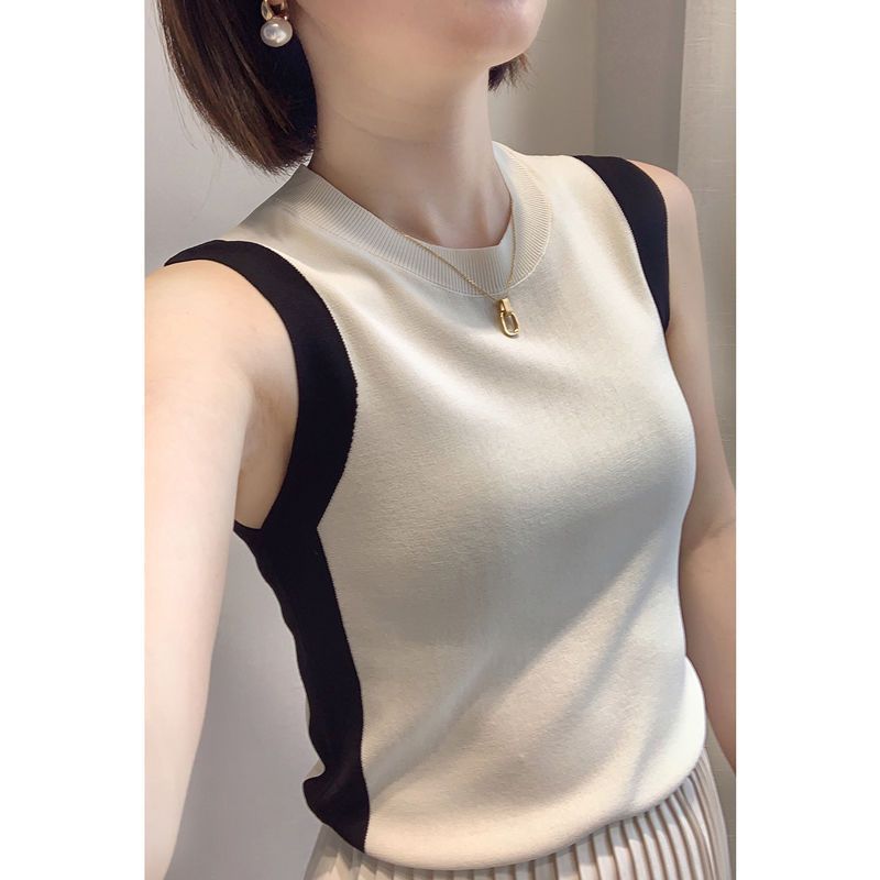 2025 新しい夏のシンプルなコントラストカラーニットベストトップ女性の夏のアウターウェアアイスシルクサスペンダーノースリーブスーツインナー