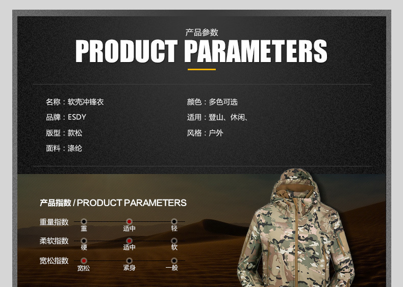 产品介绍:ESDY是美国户外品牌,以款式新颖,V4是为户外运动设计的,保暖、透气的多用途软壳冲锋衣,3层复合面料 表层100D4弹力布 中层透气PU (指数10000mm,透气指数8000g/㎡/d)里层复合细绒布
