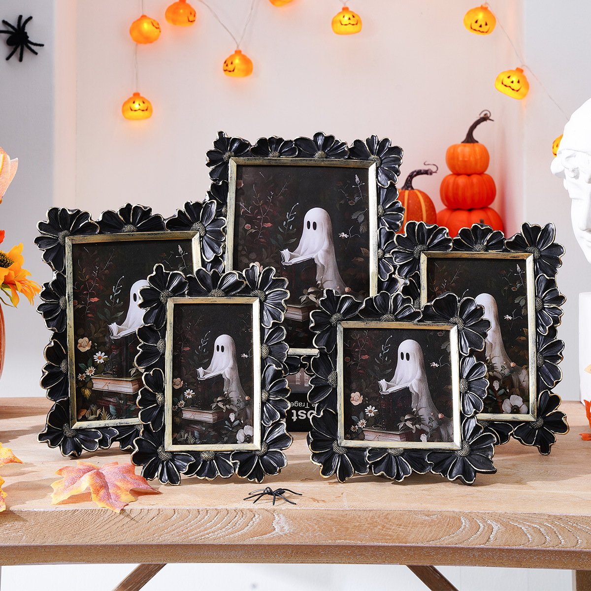 跨境万圣节法式客厅树脂材质黑白金边立体雏菊花朵造型装饰相框