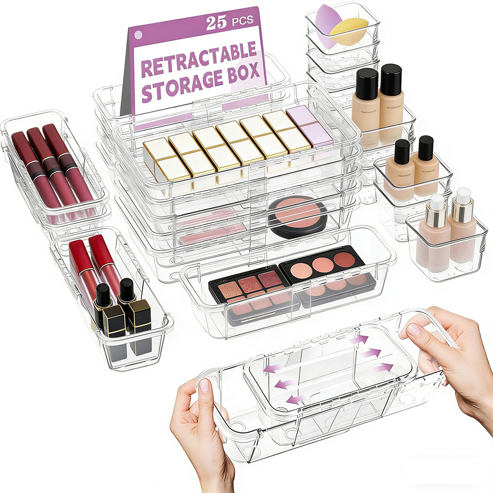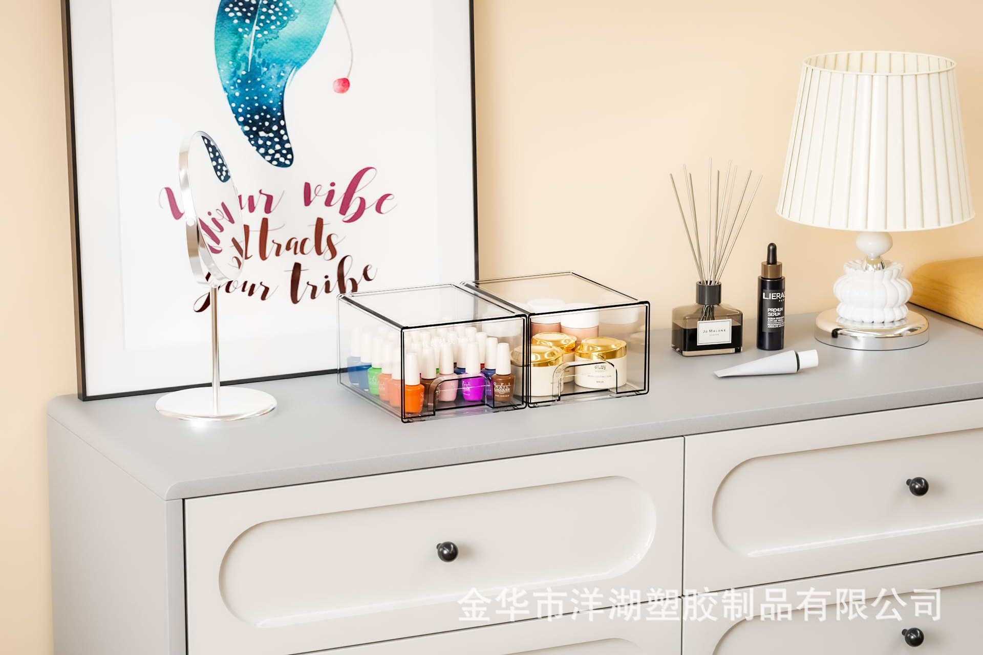 透明引き出し収納ボックスには、化粧品の防塵物を重ねて整理することができます。