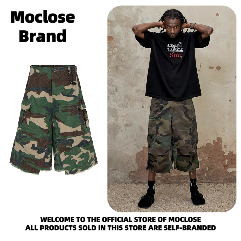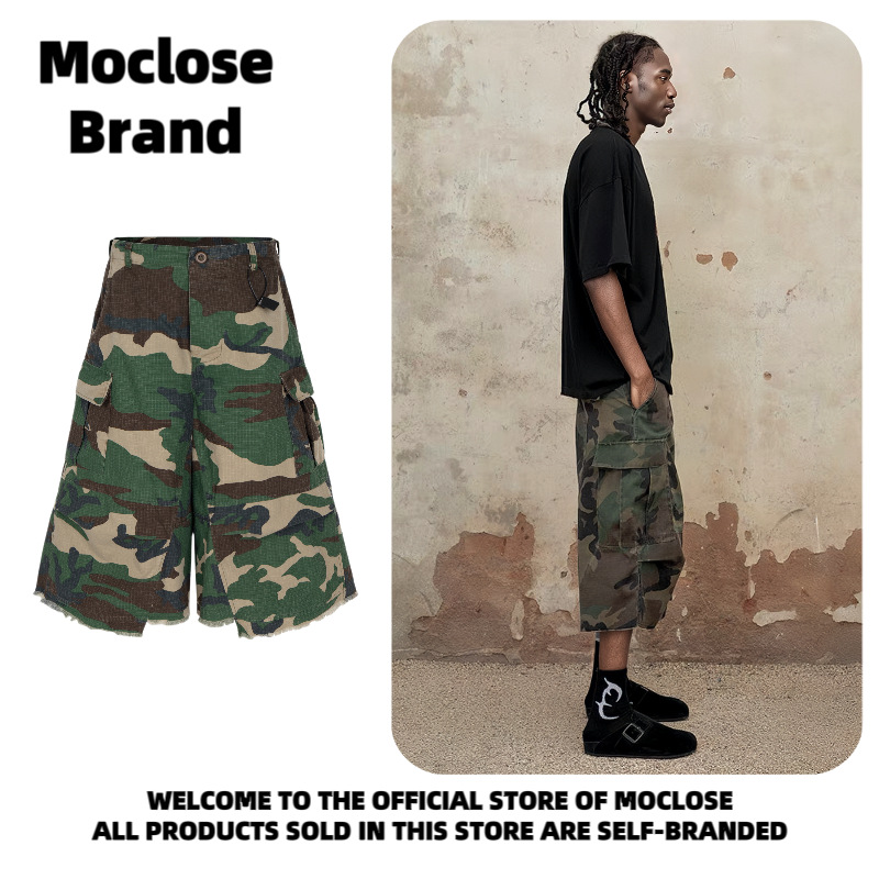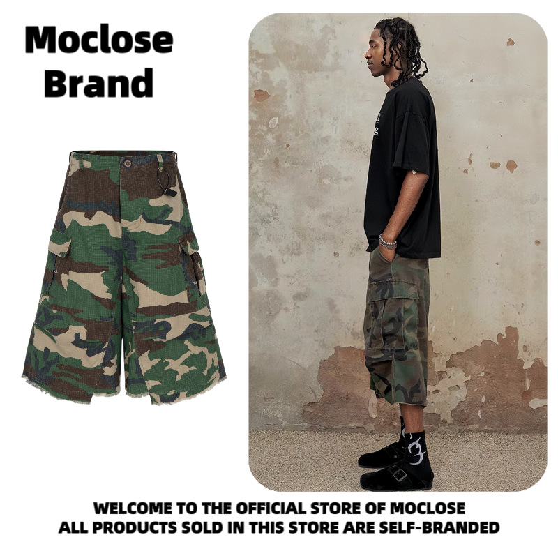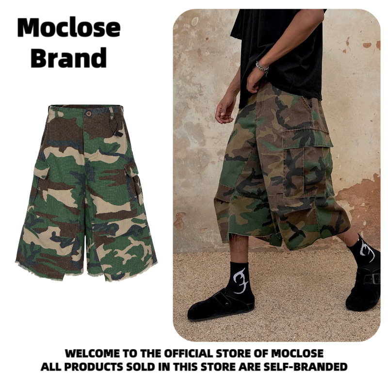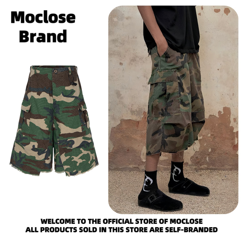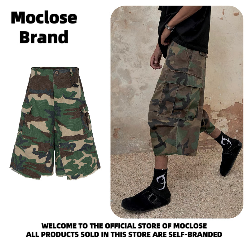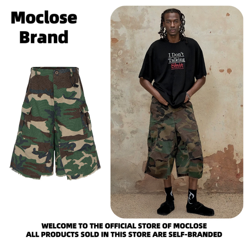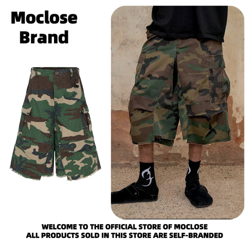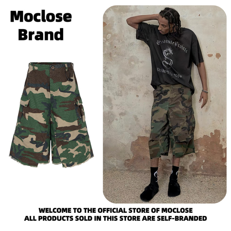 Moclose アメリカンストリート 春夏 カジュアル 迷彩 ダメージ加工 ローエッジシルエット メンズ レディース ゆったり ワークウェア クロップドショーツ