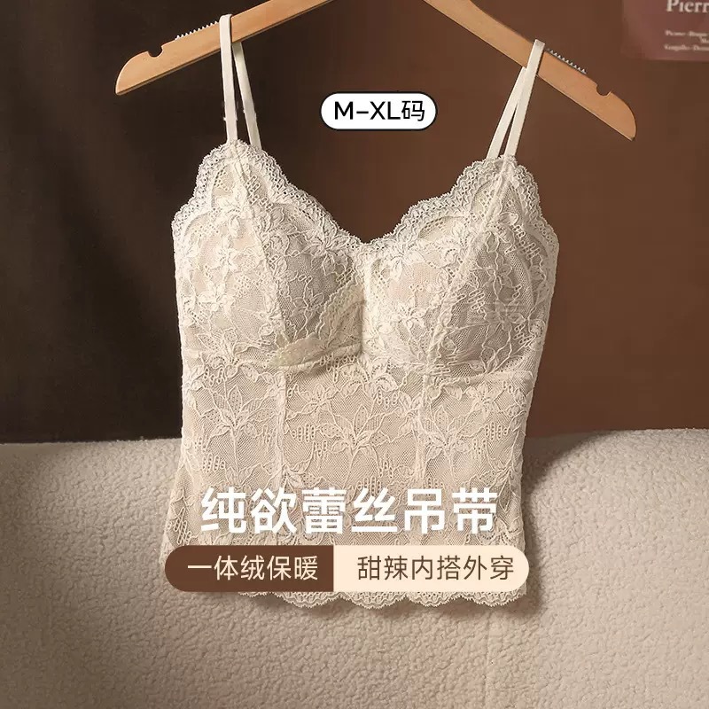 秋冬新款6099#法式蕾丝保暖一体绒吊带背心女带胸垫纯欲内搭打底