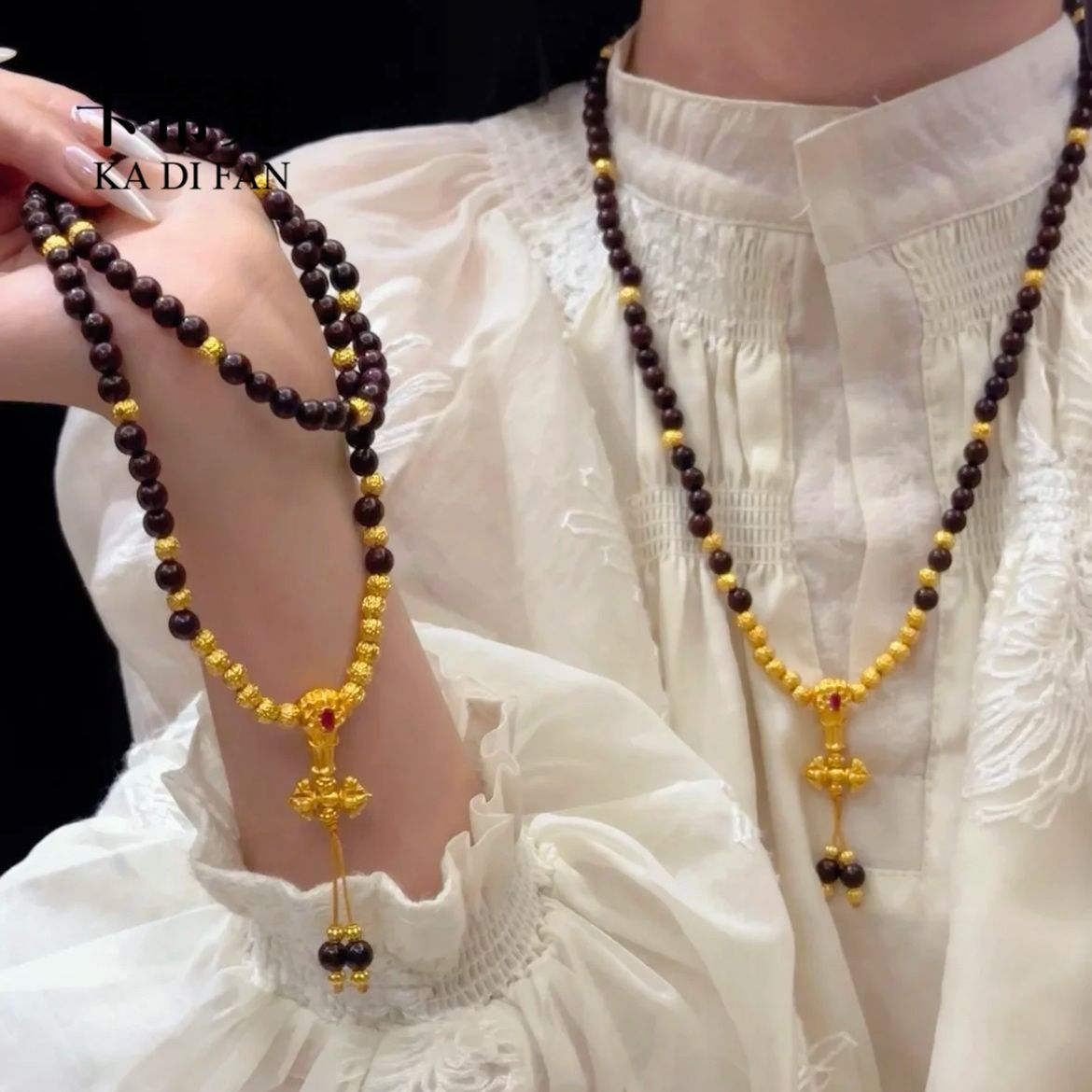 一項の二戴古法三輪小葉珠串ネックレスファッション気質軽豪華レトロ宮廷風三方手串金