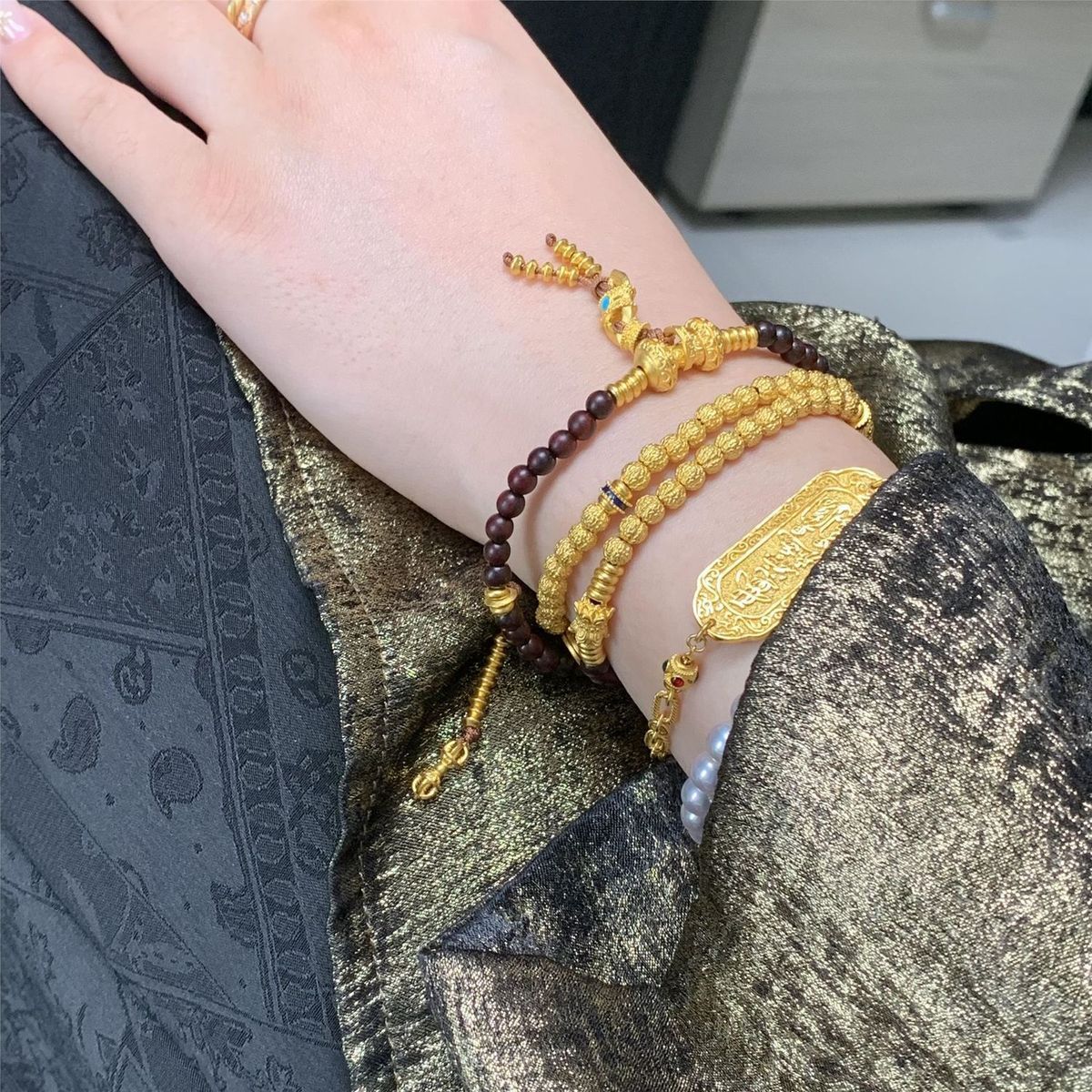 镀真金高保色沙金点钻三通金刚杵核桃珠diy檀木三圈手链沙金项链