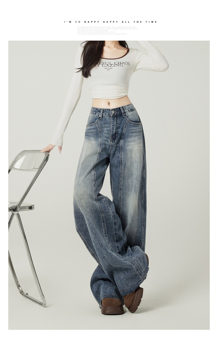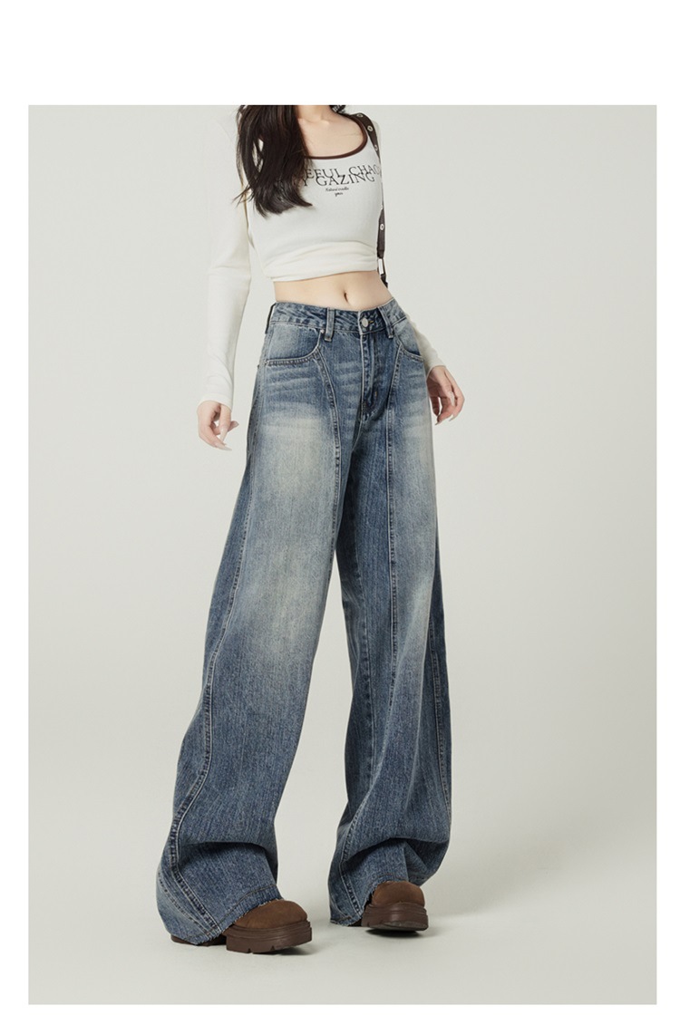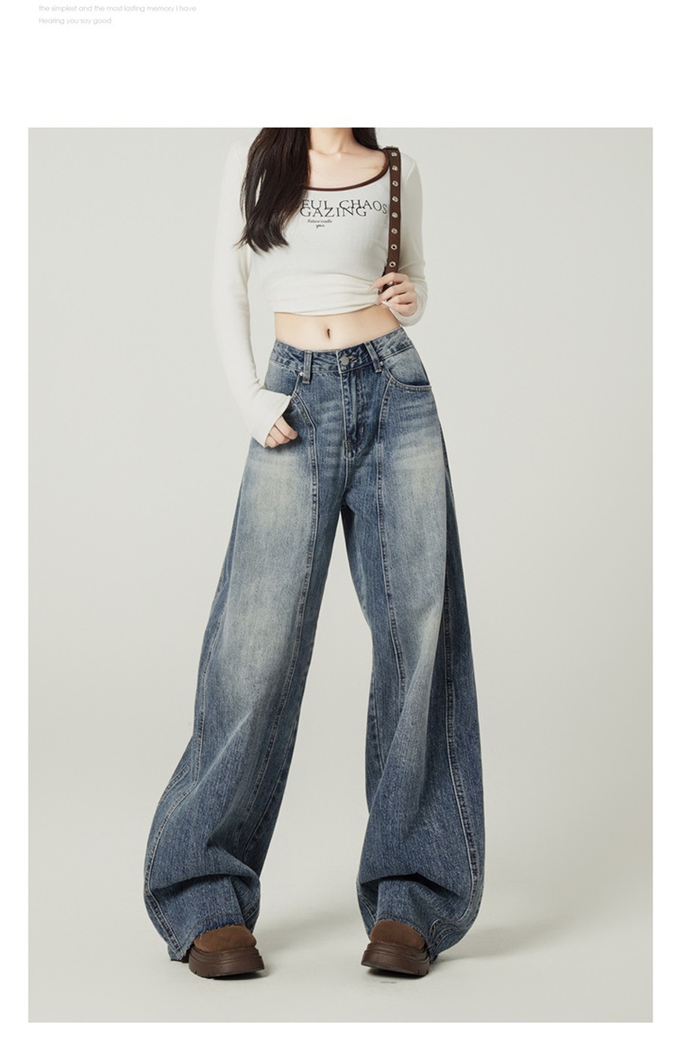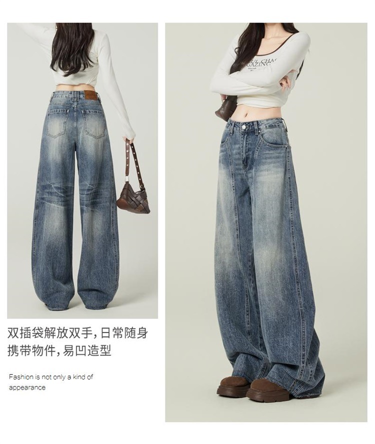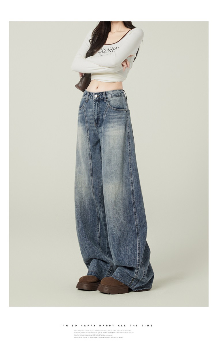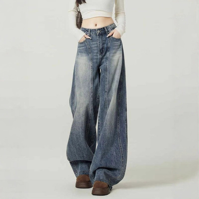 アメリカのレトロなワイドジーンズの女性は秋に腰が高くてゆったりしています。