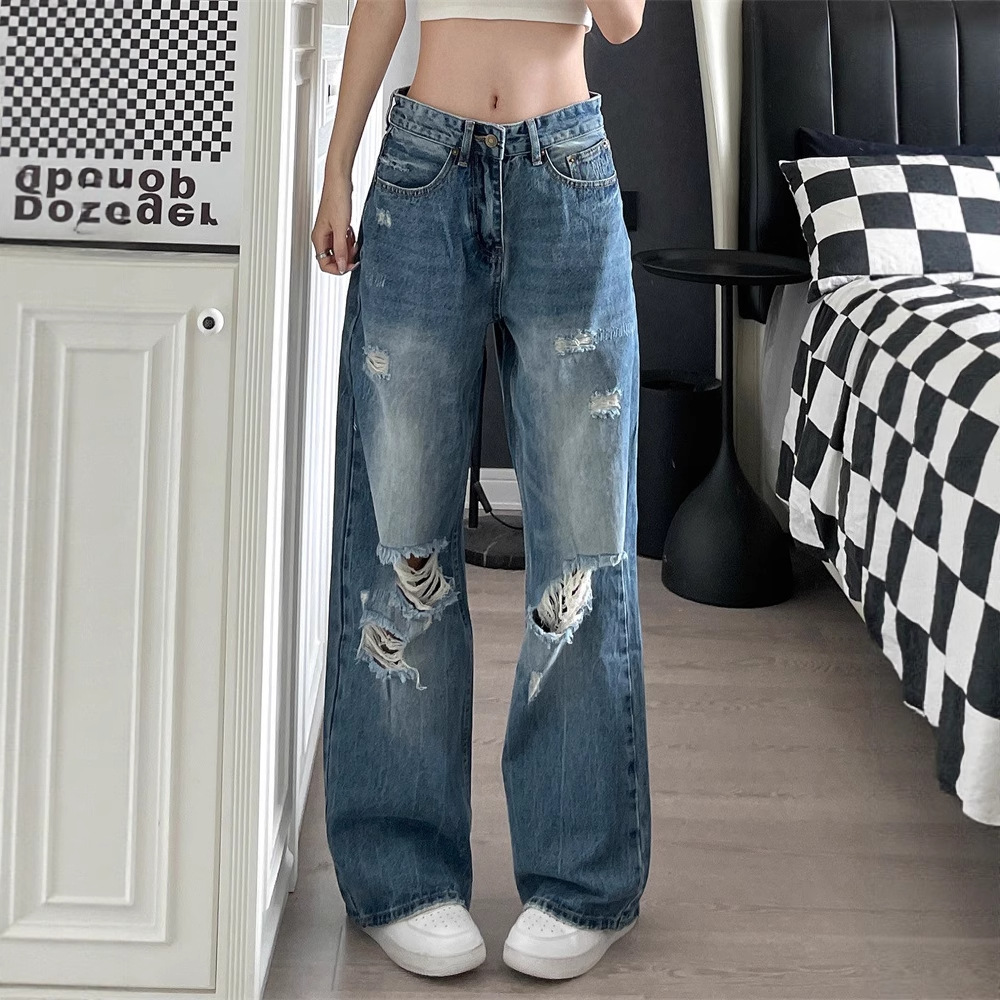 アメリカンバギーユニークなリップドジーンズ夏ストレートルーズスリムハイストリートファッションブランドパンツ女性用