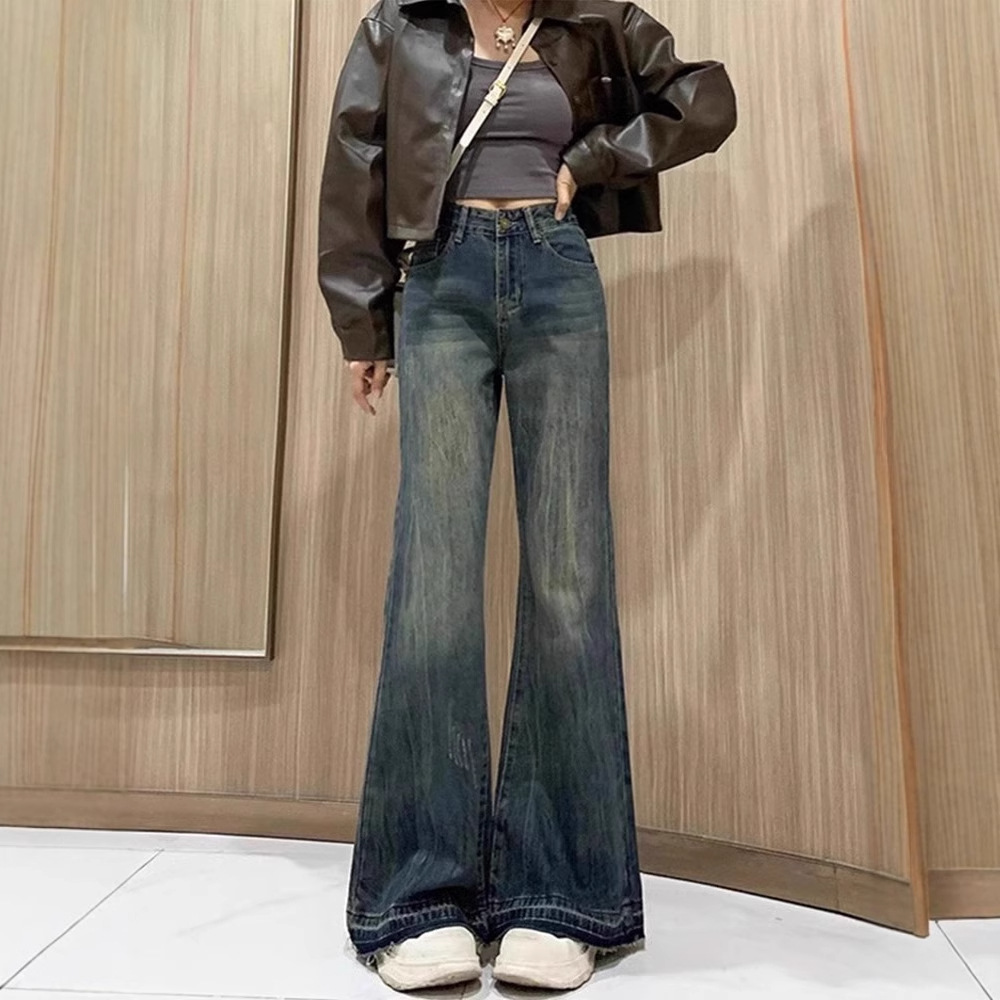 背の高い女性向けのレトロなウォッシュ加工のスクラッチ加工とほつれ加工のジーンズ、ハイウエスト、スリム、ルーズ、ストレート、ワイドレッグ、フロアレングスパンツ