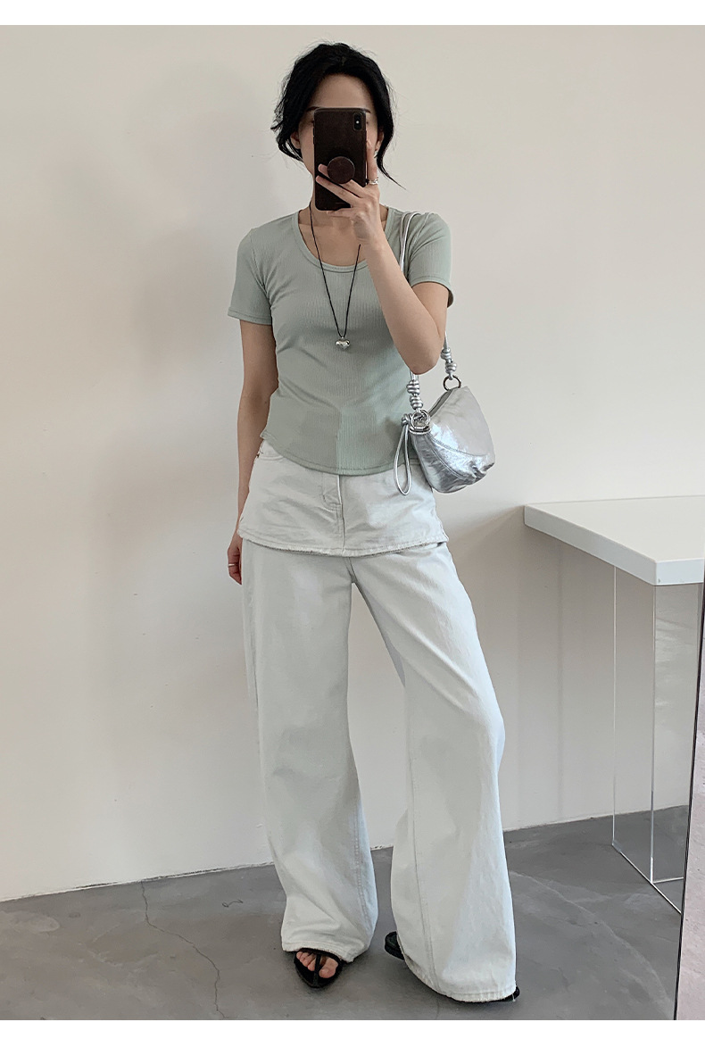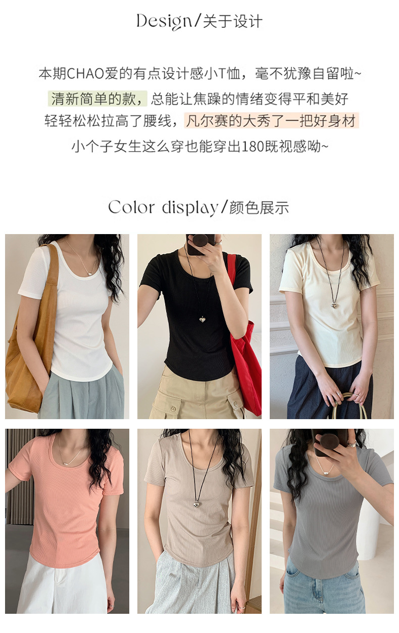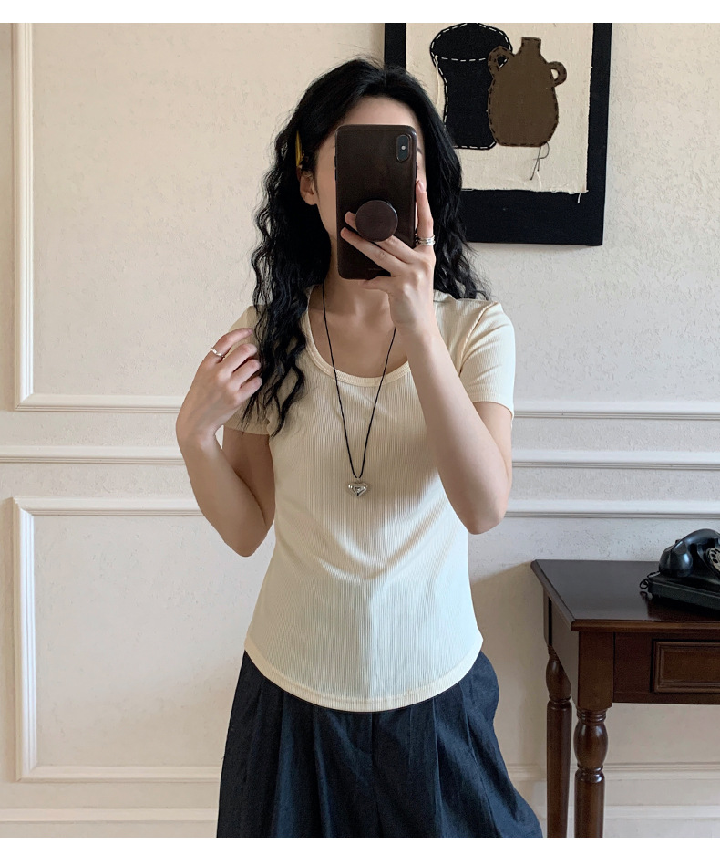 冷たい感じのシンプルな純色のUネックtシャツ女性の夏の韓国系のシンプルな百合の修身はやせています。