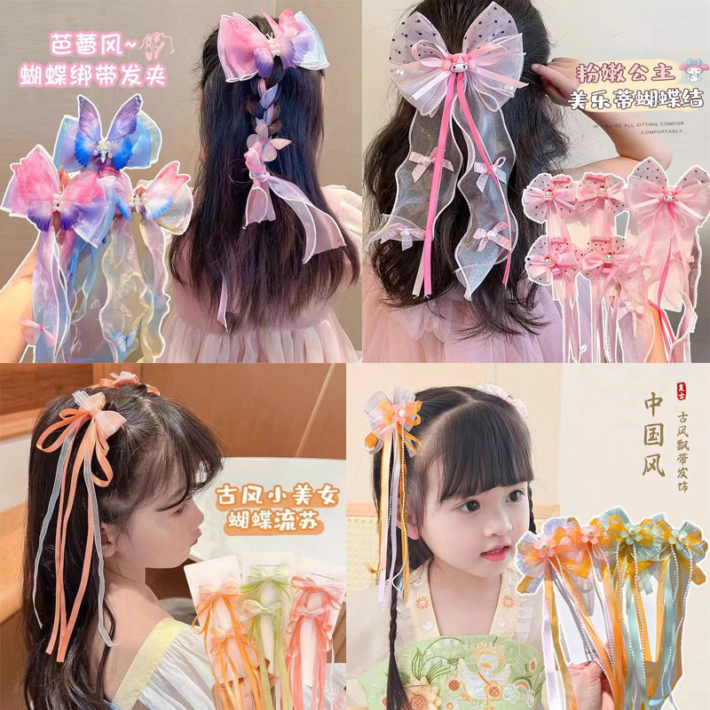 子供の漢服の頭飾りの女の子のヘアピンの古風な蝶結びの長いリボンの髪飾りの中国風の時代のフリンジヘアのクリップ