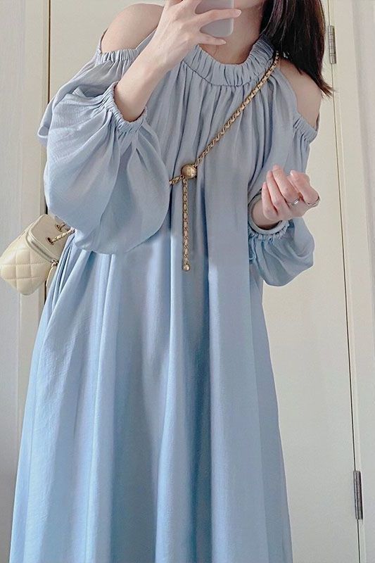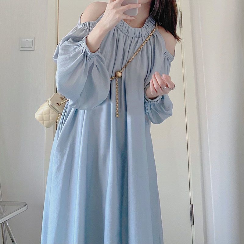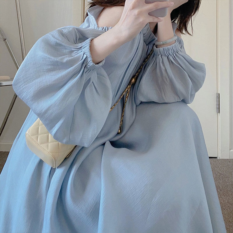 青いフランスの優しい風の泡の袖のワンピースの女性の夏のデザイン感の小さい大衆は肩を現して肉を遮ってやせている長いスカートを現します。