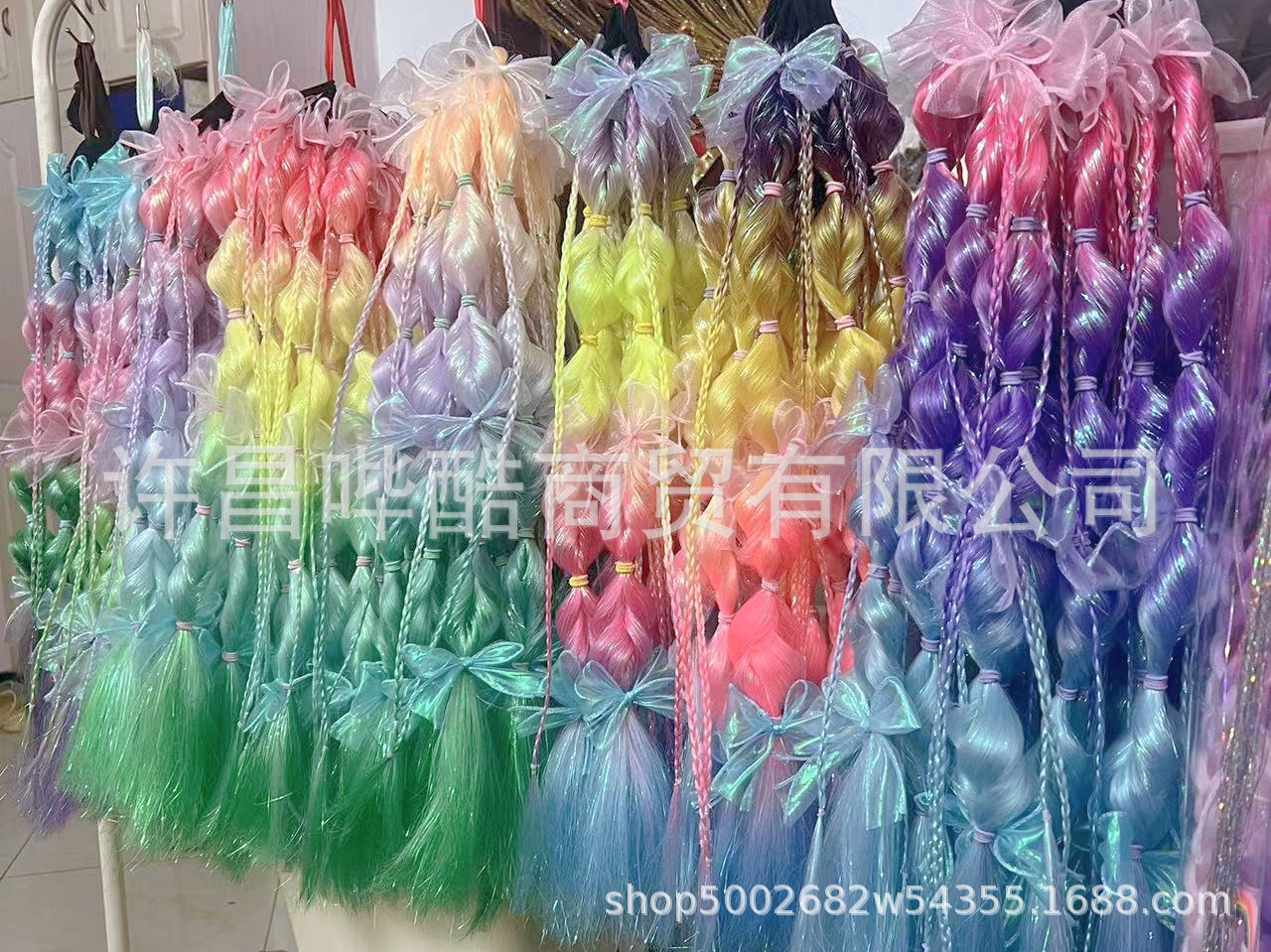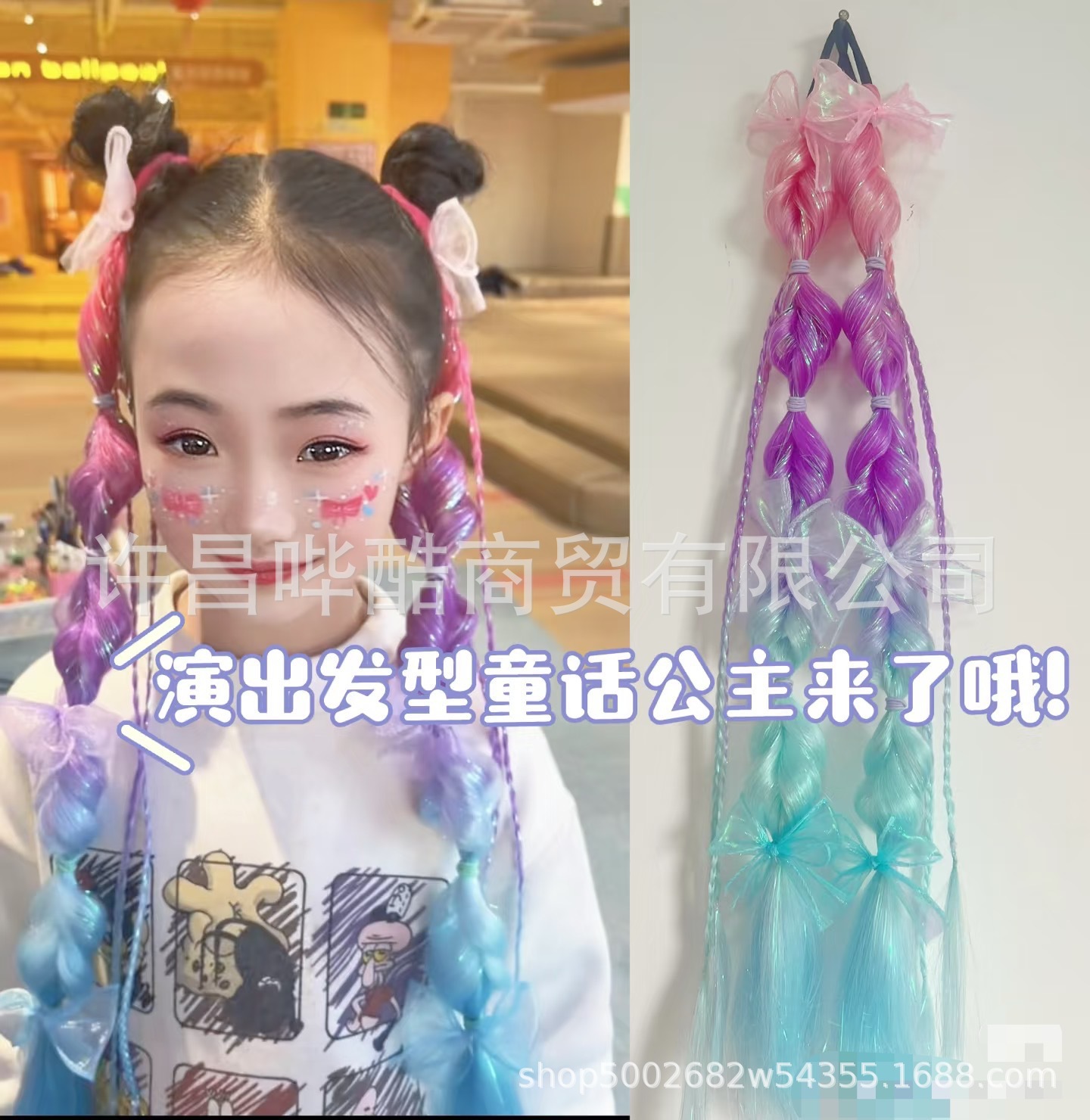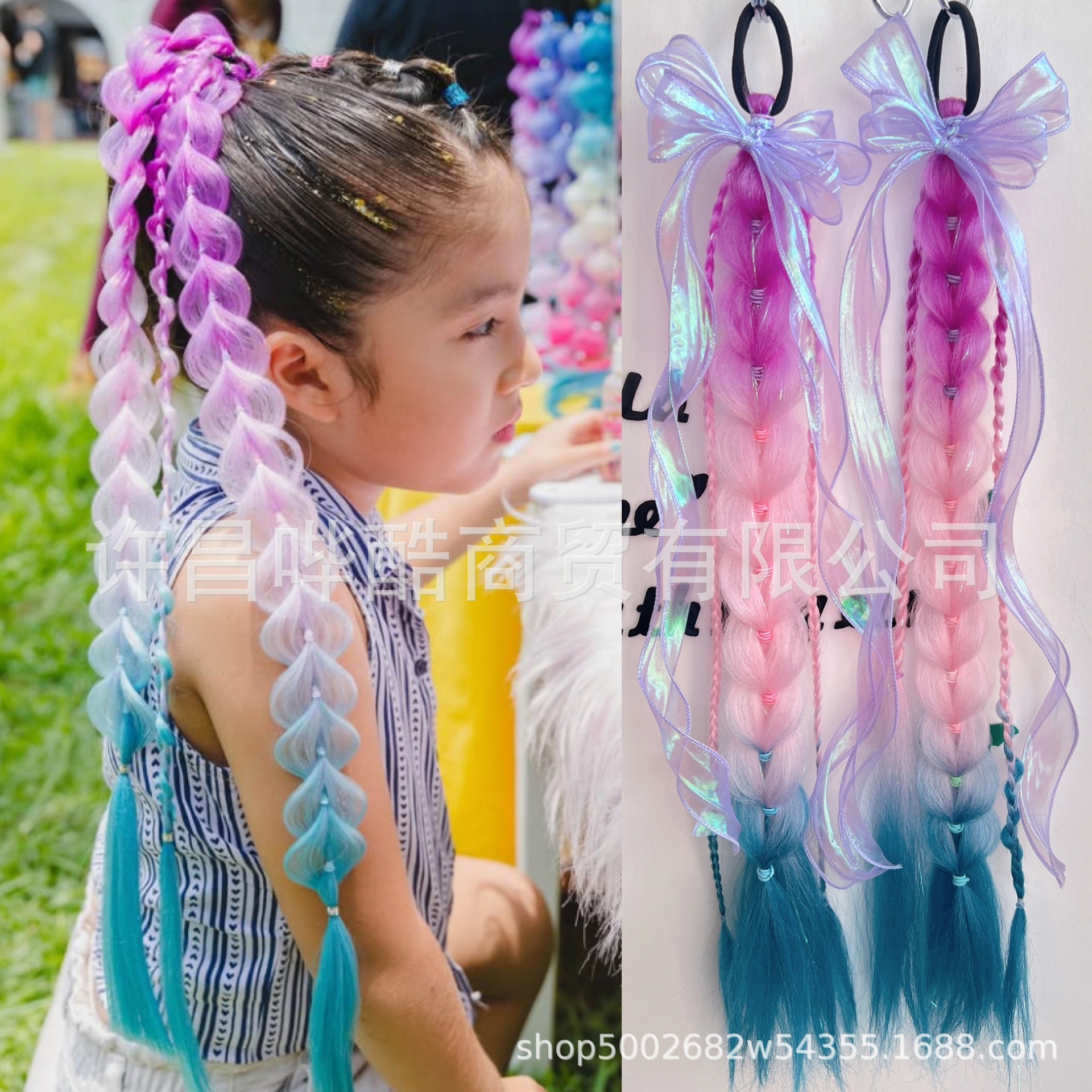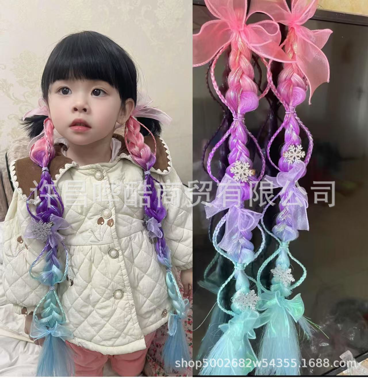 女童蝴蝶结假发马尾编发麻花辫渐变彩色儿童舞台演出节日生日礼物