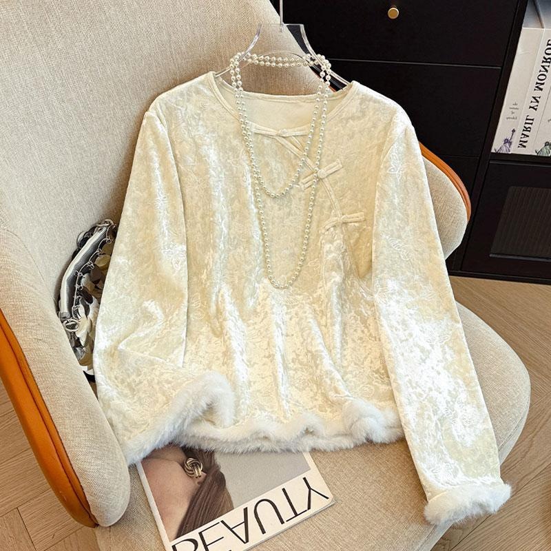 加绒加厚改良新中式国风打底衫女士气质上衣斜襟盘扣内搭长袖衬衣